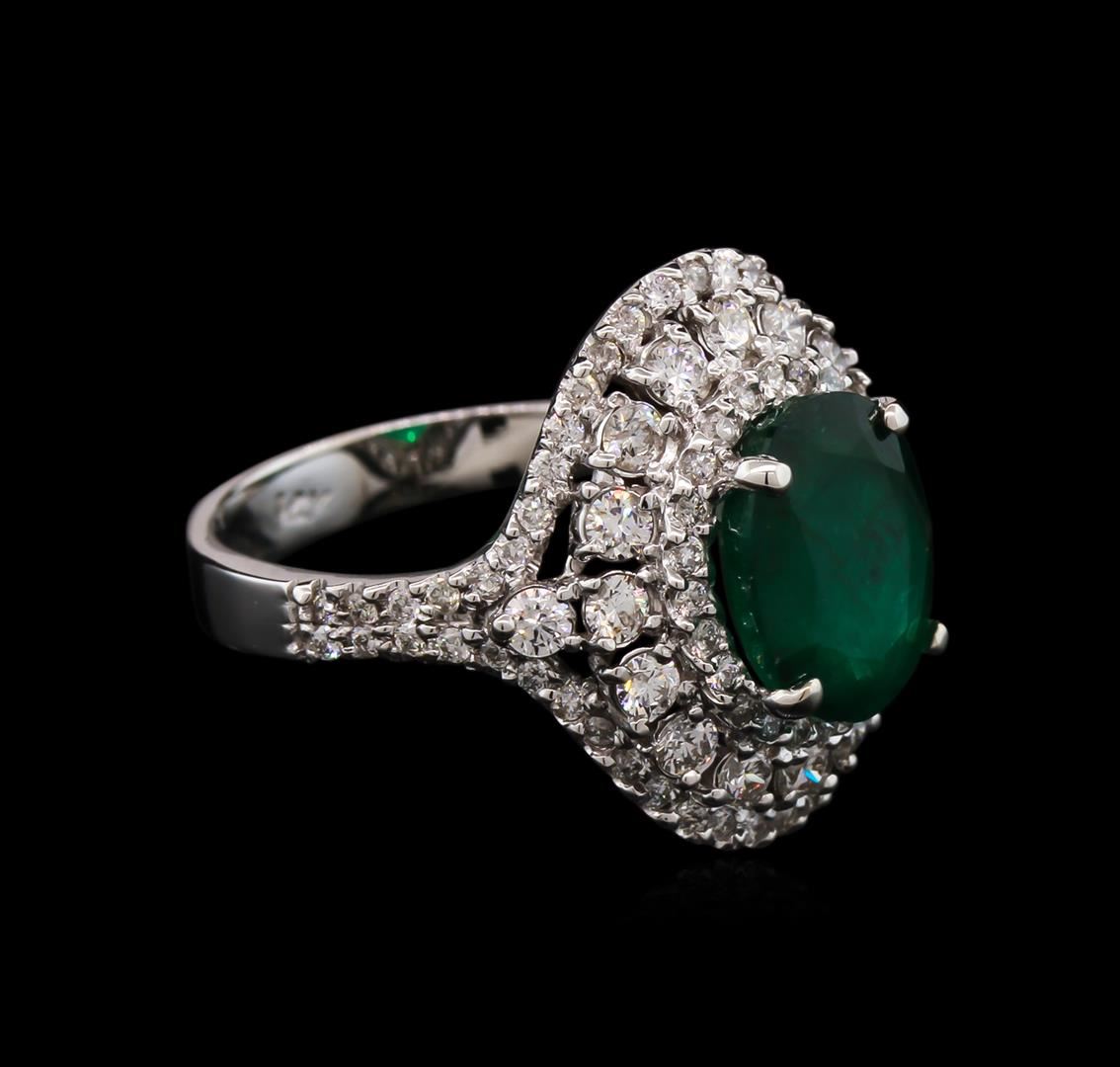One electronically tested 14KT white gold ladies cast emerald and diamond ring with a bright polish finish. The featured emerald is set within tiered diamond bezels supported by diamond set shoulders, completed by a four millimeter wide band. Identified with markings of "14K". Condition is new, good workmanship. Containing: One prong set oval mixed cut natural emerald, measuring 9.90 x 7.85 x 4.60mm, 20% bulge factor, exact weight 2.65ct., clarity is heavily included, type III, dark, very slightly grayish, very slightly bluish green color, (GIA vslbG 7/3), cut is good. Transmitting light somewhat diffusely, transparent to translucent. Naturally occurring internal & external characteristics are present. Indications of oil & opticon residue. Graded in the setting. Ninety-Eight prong set round brilliant cut diamonds, measuring 2.00 - 1.10 x 0.93mm exact total weight 98 Stones = 1.05ct. Graded in the setting. Clarity: SI-1 to I-1. Color: G - I. Total Weight of Colored Stones 2.65ct. Total Weight of Diamonds 1.05ct. Total Weight of Ring 5.26gm. AIG Appraised at $5,530.00.