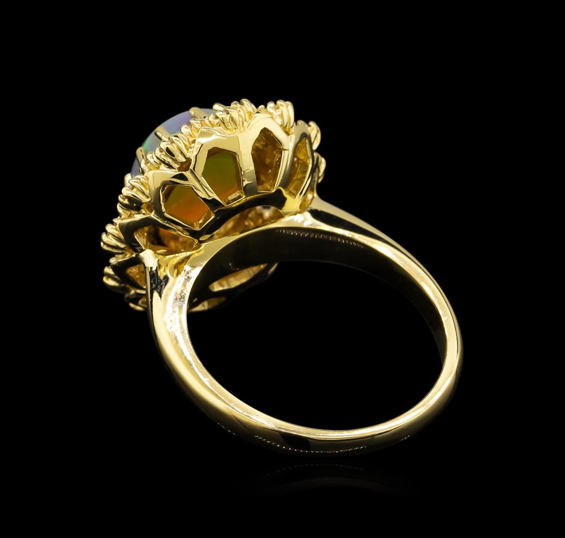 One ring featuring: 14KT yellow gold weighing 6.73 grams containing one opal with a total weight of 2.65ct and side diamonds with a total weight of 0.58ct.