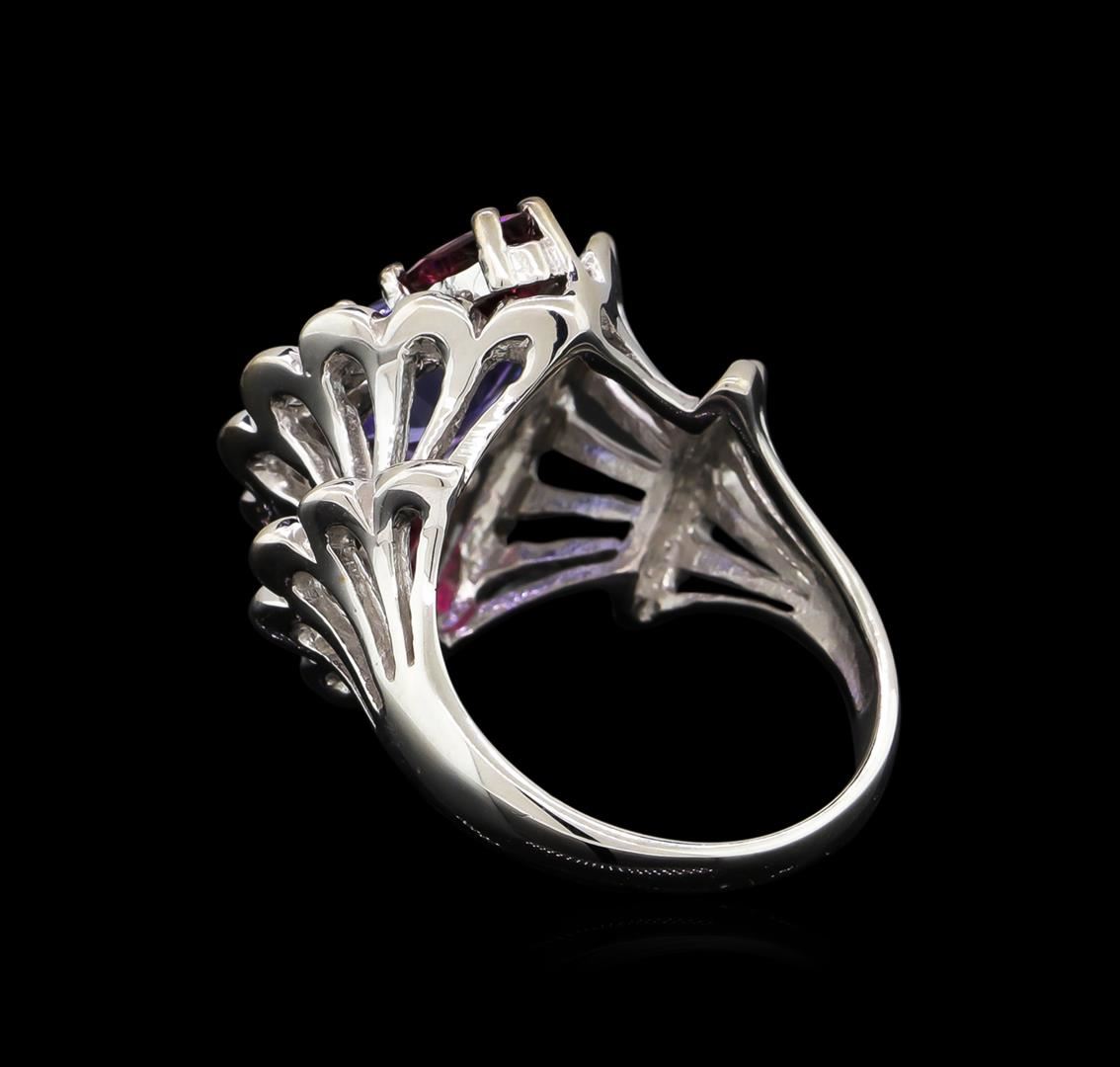 One electronically tested 14KT white gold lady's cast fashion ring with a bright polish finish. The featured lady's ring has trumpet floral motif and a shank measuring 2.64 millimeters wide. Identified with markings of "K14". Condition is new, good workmanship. Containing: One prong set oval modified brilliant cut natural tanzanite, measuring 10.10 x 7.84 x 4.92mm, approximate weight of 2.65ct., clarity is eye clean, type I, medium light, moderately strong, bluish violet color, (GIA bV 4/4), cut is good. Transmitting light with no distortion, transparent. Colored gemstones are presumed to have been subjected to commonly used enhancement processes. Graded in the setting. Two prong set pear modified brilliant cut natural pink tourmalines, measuring 7.10 x 4.96 x 2.85mm, approximate total weight of 1.22ct., clarity is eye clean, type II, medium, moderately strong, strongly purplish red color, (GIA stpR 5/4), cut is good. Transmitting light with no distortion, transparent. Colored gemstones are presumed to have been subjected to commonly used enhancement processes. Graded in the setting. Twelve prong set round brilliant cut diamonds, measuring 1.90 - 1.80 x 1.15mm (depth est.) approximate total weight of 12 Stones = 0.30ct. Graded in the setting. Clarity: SI-1 to SI-2. Color: H - I. Cut Good. Total Weight of Colored Stones 3.87ct. Total Weight of Diamonds 0.30ct. Total Weight of Ring 9.40gm. GAS Appraised at $6,210.00.