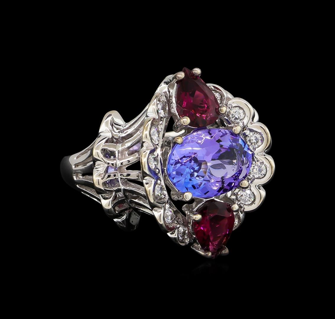 One electronically tested 14KT white gold lady's cast fashion ring with a bright polish finish. The featured lady's ring has trumpet floral motif and a shank measuring 2.64 millimeters wide. Identified with markings of "K14". Condition is new, good workmanship. Containing: One prong set oval modified brilliant cut natural tanzanite, measuring 10.10 x 7.84 x 4.92mm, approximate weight of 2.65ct., clarity is eye clean, type I, medium light, moderately strong, bluish violet color, (GIA bV 4/4), cut is good. Transmitting light with no distortion, transparent. Colored gemstones are presumed to have been subjected to commonly used enhancement processes. Graded in the setting. Two prong set pear modified brilliant cut natural pink tourmalines, measuring 7.10 x 4.96 x 2.85mm, approximate total weight of 1.22ct., clarity is eye clean, type II, medium, moderately strong, strongly purplish red color, (GIA stpR 5/4), cut is good. Transmitting light with no distortion, transparent. Colored gemstones are presumed to have been subjected to commonly used enhancement processes. Graded in the setting. Twelve prong set round brilliant cut diamonds, measuring 1.90 - 1.80 x 1.15mm (depth est.) approximate total weight of 12 Stones = 0.30ct. Graded in the setting. Clarity: SI-1 to SI-2. Color: H - I. Cut Good. Total Weight of Colored Stones 3.87ct. Total Weight of Diamonds 0.30ct. Total Weight of Ring 9.40gm. GAS Appraised at $6,210.00.