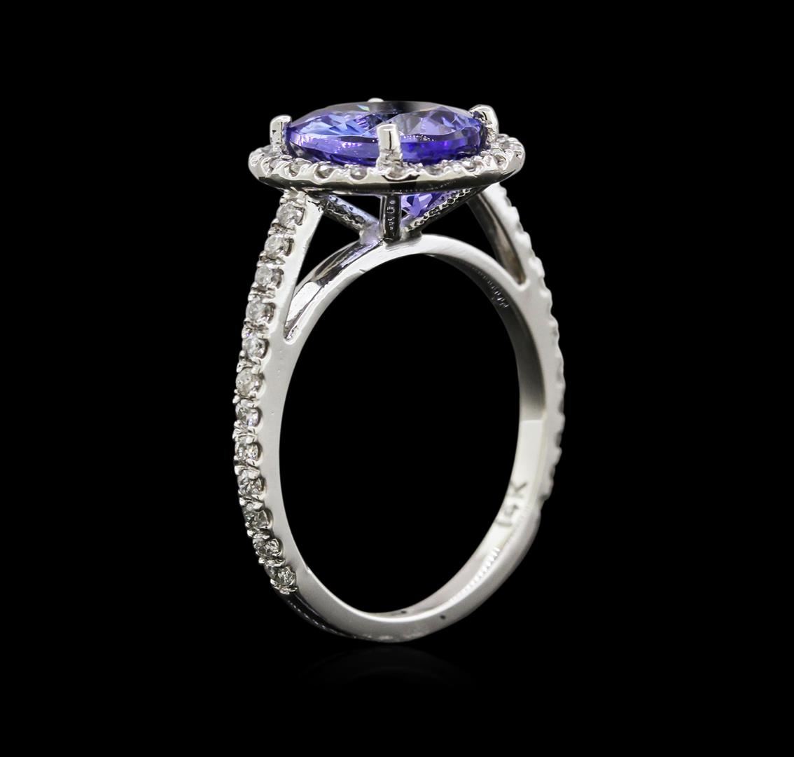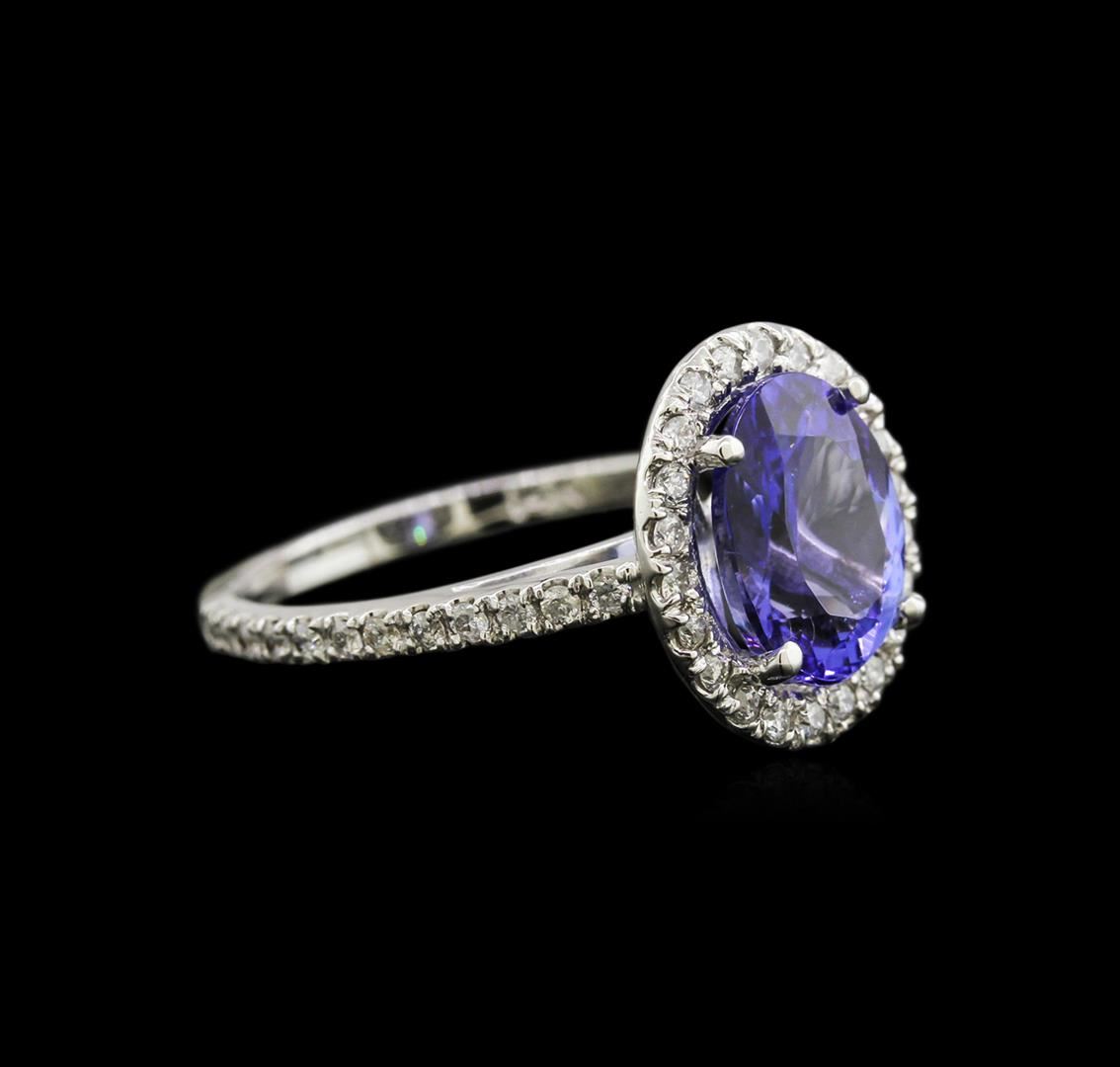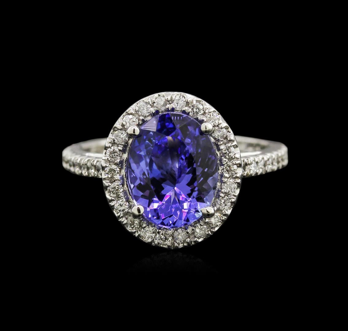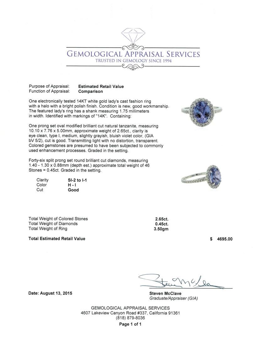 One electronically tested 14KT white gold lady's cast fashion ring with a halo with a bright polish finish. The featured lady's ring has a shank measuring 1.75 millimeters in width. Identified with markings of "14K". Condition is new, good workmanship. Containing: One prong set oval modified brilliant cut natural tanzanite, measuring 10.10 x 7.76 x 5.00mm, approximate weight of 2.65ct., clarity is eye clean, type I, medium, slightly grayish, bluish violet color, (GIA bV 5/2), cut is good. Transmitting light with no distortion, transparent. Colored gemstones are presumed to have been subjected to commonly used enhancement processes. Graded in the setting. Forty-Six split prong set round brilliant cut diamonds, measuring 1.40 - 1.30 x 0.88mm (depth est.) approximate total weight of 46 Stones = 0.45ct. Graded in the setting. Clarity: SI-2 to I-1. Color: H - I. Cut Good. Total Weight of Colored Stones 2.65ct. Total Weight of Diamonds 0.45ct. Total Weight of Ring 3.50gm. GAS Appraised at $4,695.00.
