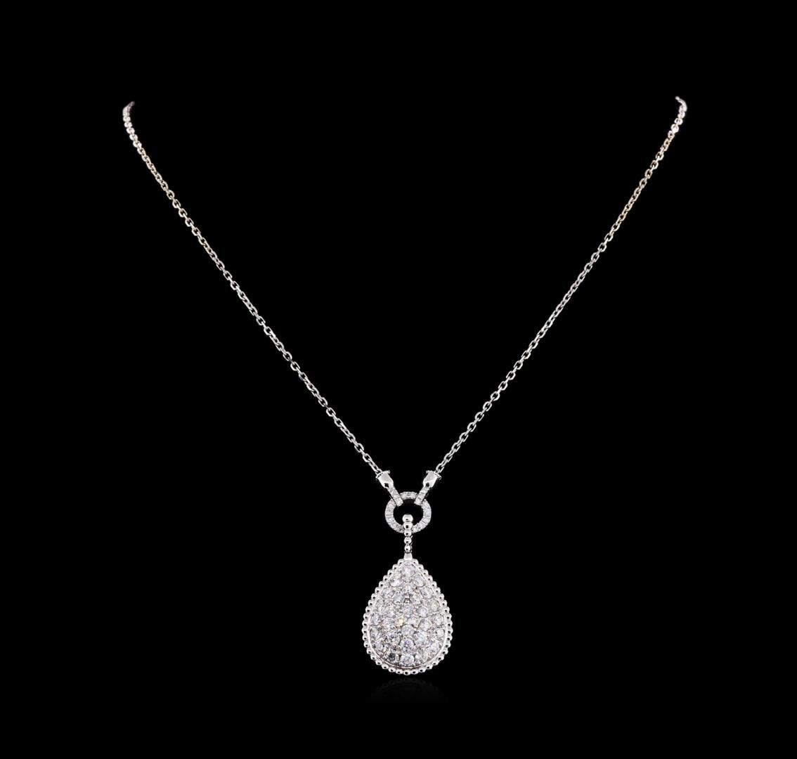 One electronically tested 14KT white gold lady's combination cast & assembled fashion necklace with a lobster claw clasp with a bright polish finish. The featured lady's necklace has a 17 inch long, 1.7mm wide diamond cut cable link chain with lobster claw clasp with a 41 millimeter drop. Identified with markings of "K14". Condition is new, good workmanship. Containing: Thirty prong set round brilliant cut diamonds, measuring 2.85 - 2.70 x 1.72mm (depth est.) approximate total weight of 30 Stones = 2.42ct. Graded in the setting. Clarity: VS-2 to SI-2. Color: H - I. Cut Very Good Twelve prong set round brilliant cut diamonds, measuring 1.60 - 1.50 x 0.96mm (depth est.) approximate total weight of 12 Stones = 0.18ct. Graded in the setting. Clarity: SI-1 to SI-2. Color: H - I. Cut Good Six prong set round brilliant cut diamonds, measuring 1.40 - 1.35 x 0.86mm (depth est.) approximate total weight of 6 Stones = 0.06ct. Graded in the setting. Clarity: SI-1 to SI-2. Color: H - I. Cut Good. Total Weight of Diamonds 2.66ct. Total Weight of Necklace 11.60gm. GAS Appraised at $9,660.00.