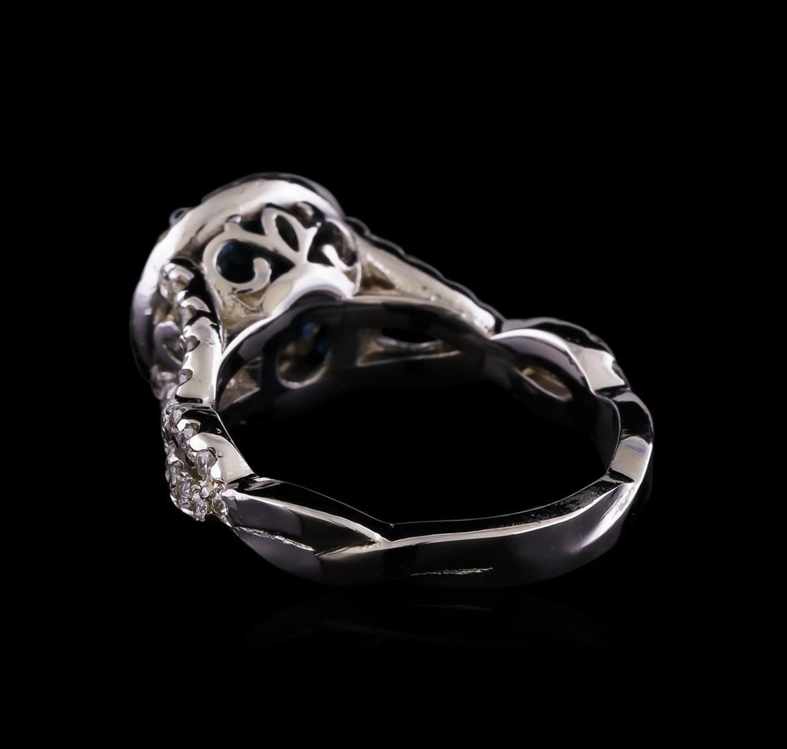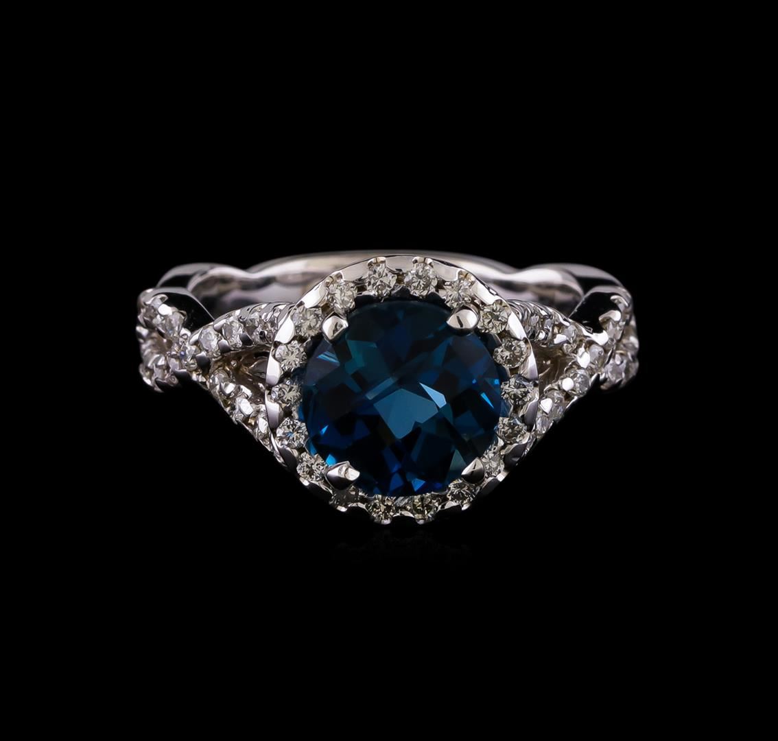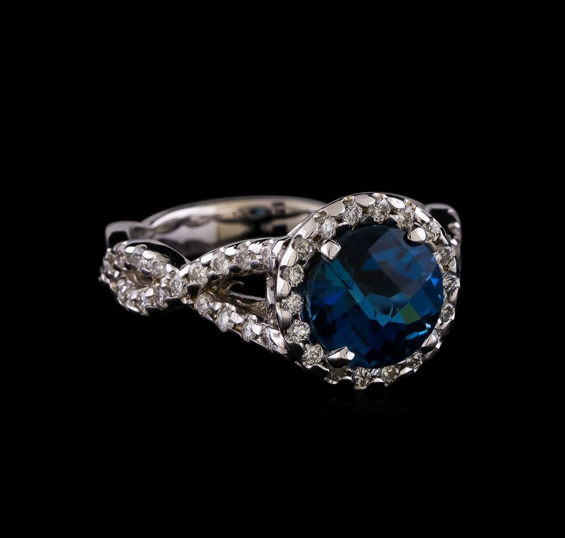 One ring : 14KT white gold weighing 5.82gm containing one london blue topaz center stone with a total weight of 2.66ct. and side diamonds weighing 0.57ctw.