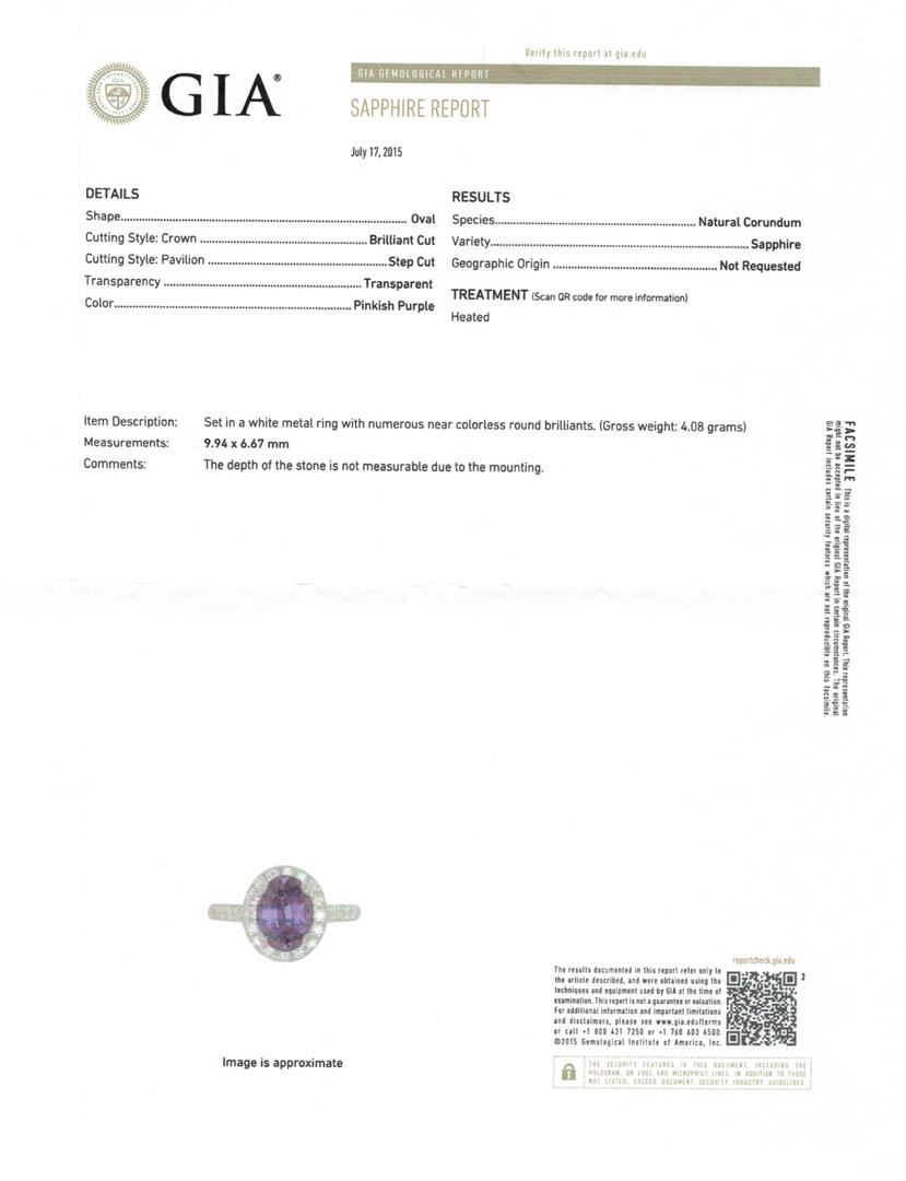 One electronically tested 14KT white gold lady's cast fashion ring with a basket halo with a bright polish finish. The featured lady's ring has a diamond halo gallery set underneath an oval halo with a shank measuring 1.80 millimeters wide. Identified with markings of '14K'. Condition is new, good workmanship. Containing: One prong set oval modified mixed cut natural purple sapphire, measuring 9.94 x 6.67 x 4.34mm, (depth est.) 10%. bulge factor, approximate weight of 2.66ct., clarity is slightly included, medium dark, strong, reddish purple color, (GIA rP 6/5), cut is very good. Transmitting light with a minimum of distortion, transparent. Colored gemstones are presumed to have been subjected to commonly used enhancement processes. Graded in the setting in the GIA Laboratory, Report #5171220966. Twenty-Eight prong set round brilliant cut diamonds, measuring 1.70 - 1.60 x 1.02mm (depth est.) approximate total weight of 28 Stones = 0.48ct. Graded in the setting. Clarity VS-1 to VS-2. Color: G - H Cut Very Good Fourteen prong set round brilliant cut diamonds, measuring 1.40 - 1.35 x 0.86mm (depth est.) approximate total weight of 14 Stones = 0.14ct. Graded in the setting. Clarity VS-2 to SI-1. Color: G - H Cut Good. Total Weight of Colored Stones 2.66ct.. Total Weight of Diamonds 0.62ct.. Total Weight of Ring 4.00gm GAS Appraised at $9,375.00.