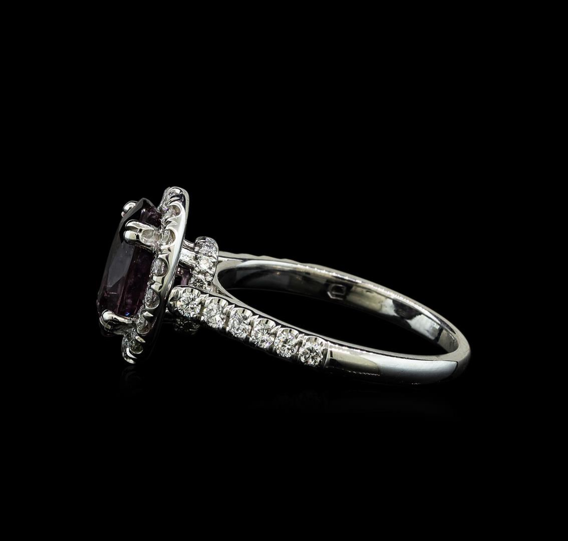 One electronically tested 14KT white gold lady's cast fashion ring with a basket halo with a bright polish finish. The featured lady's ring has a diamond halo gallery set underneath an oval halo with a shank measuring 1.80 millimeters wide. Identified with markings of '14K'. Condition is new, good workmanship. Containing: One prong set oval modified mixed cut natural purple sapphire, measuring 9.94 x 6.67 x 4.34mm, (depth est.) 10%. bulge factor, approximate weight of 2.66ct., clarity is slightly included, medium dark, strong, reddish purple color, (GIA rP 6/5), cut is very good. Transmitting light with a minimum of distortion, transparent. Colored gemstones are presumed to have been subjected to commonly used enhancement processes. Graded in the setting in the GIA Laboratory, Report #5171220966. Twenty-Eight prong set round brilliant cut diamonds, measuring 1.70 - 1.60 x 1.02mm (depth est.) approximate total weight of 28 Stones = 0.48ct. Graded in the setting. Clarity VS-1 to VS-2. Color: G - H Cut Very Good Fourteen prong set round brilliant cut diamonds, measuring 1.40 - 1.35 x 0.86mm (depth est.) approximate total weight of 14 Stones = 0.14ct. Graded in the setting. Clarity VS-2 to SI-1. Color: G - H Cut Good. Total Weight of Colored Stones 2.66ct.. Total Weight of Diamonds 0.62ct.. Total Weight of Ring 4.00gm GAS Appraised at $9,375.00.