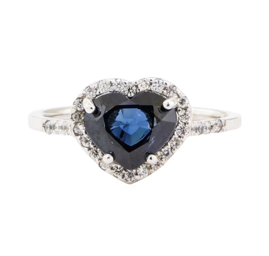One electronically tested 18KT white gold lady's cast fashion heart shape ring with a basket halo with a bright polish finish. The featured lady's ring has a shank measuring 1.35 millimeters wide. Identified with markings of '18K'. Condition is new, good workmanship. Containing: One prong set heart modified brilliant cut natural blue sapphire, measuring 7.15 x 8.59 x 4.52mm, (depth est.) approximate weight of 2.38ct., clarity is eye clean, medium dark, moderately strong, blue color, (GIA B 6/4), cut is very good. Transmitting light with no distortion, transparent. Colored gemstones are presumed to have been subjected to commonly used enhancement processes. Graded in the setting. Thirty-Six prong set round brilliant cut diamonds, measuring 1.35 - 1.25 x 0.81mm (depth est.) approximate total weight of 36 Stones = 0.28ct. Graded in the setting. Color H - I Clarity VS-2 to SI-2 Cut Good. Total Weight of Colored Stones 2.38ct.. Total Weight of Diamonds 0.28ct.. Total Weight of Ring 2.60gm GAS Appraised at $10660.00. GAS Appraised.