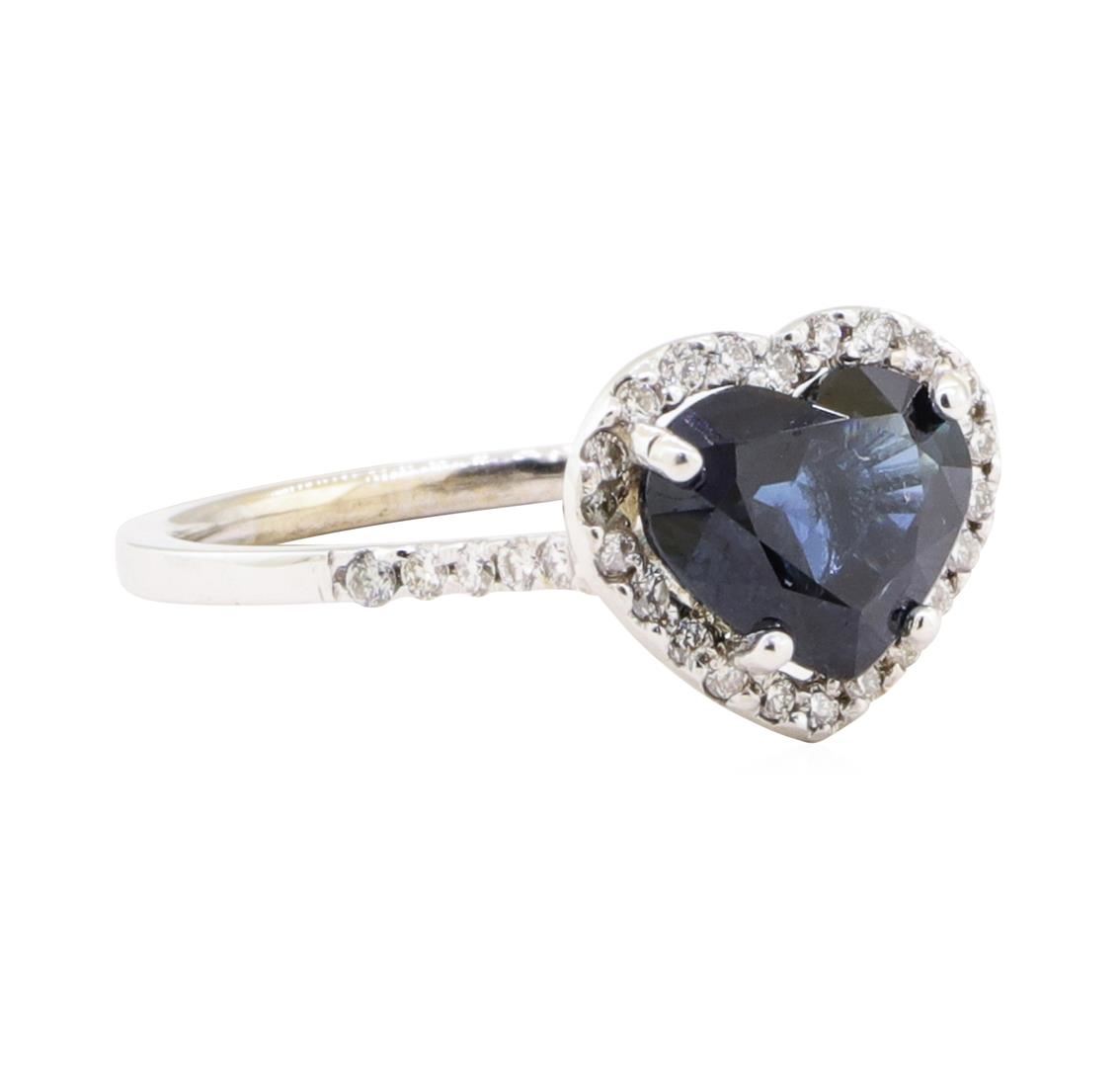 One electronically tested 18KT white gold lady's cast fashion heart shape ring with a basket halo with a bright polish finish. The featured lady's ring has a shank measuring 1.35 millimeters wide. Identified with markings of '18K'. Condition is new, good workmanship. Containing: One prong set heart modified brilliant cut natural blue sapphire, measuring 7.15 x 8.59 x 4.52mm, (depth est.) approximate weight of 2.38ct., clarity is eye clean, medium dark, moderately strong, blue color, (GIA B 6/4), cut is very good. Transmitting light with no distortion, transparent. Colored gemstones are presumed to have been subjected to commonly used enhancement processes. Graded in the setting. Thirty-Six prong set round brilliant cut diamonds, measuring 1.35 - 1.25 x 0.81mm (depth est.) approximate total weight of 36 Stones = 0.28ct. Graded in the setting. Color H - I Clarity VS-2 to SI-2 Cut Good. Total Weight of Colored Stones 2.38ct.. Total Weight of Diamonds 0.28ct.. Total Weight of Ring 2.60gm GAS Appraised at $10660.00. GAS Appraised.