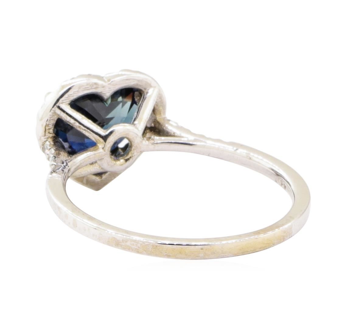One electronically tested 18KT white gold lady's cast fashion heart shape ring with a basket halo with a bright polish finish. The featured lady's ring has a shank measuring 1.35 millimeters wide. Identified with markings of '18K'. Condition is new, good workmanship. Containing: One prong set heart modified brilliant cut natural blue sapphire, measuring 7.15 x 8.59 x 4.52mm, (depth est.) approximate weight of 2.38ct., clarity is eye clean, medium dark, moderately strong, blue color, (GIA B 6/4), cut is very good. Transmitting light with no distortion, transparent. Colored gemstones are presumed to have been subjected to commonly used enhancement processes. Graded in the setting. Thirty-Six prong set round brilliant cut diamonds, measuring 1.35 - 1.25 x 0.81mm (depth est.) approximate total weight of 36 Stones = 0.28ct. Graded in the setting. Color H - I Clarity VS-2 to SI-2 Cut Good. Total Weight of Colored Stones 2.38ct.. Total Weight of Diamonds 0.28ct.. Total Weight of Ring 2.60gm GAS Appraised at $10660.00. GAS Appraised.