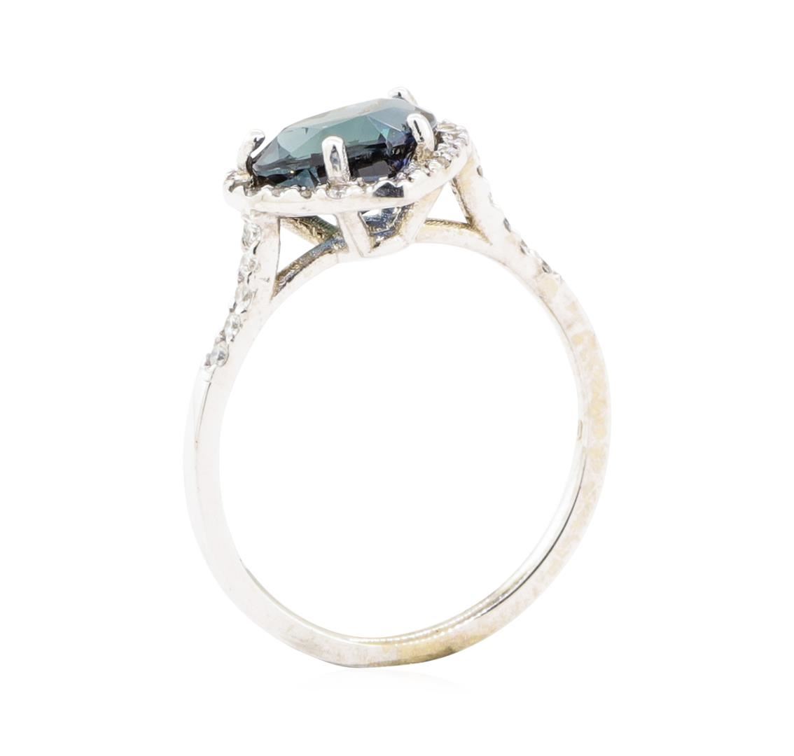 One electronically tested 18KT white gold lady's cast fashion heart shape ring with a basket halo with a bright polish finish. The featured lady's ring has a shank measuring 1.35 millimeters wide. Identified with markings of '18K'. Condition is new, good workmanship. Containing: One prong set heart modified brilliant cut natural blue sapphire, measuring 7.15 x 8.59 x 4.52mm, (depth est.) approximate weight of 2.38ct., clarity is eye clean, medium dark, moderately strong, blue color, (GIA B 6/4), cut is very good. Transmitting light with no distortion, transparent. Colored gemstones are presumed to have been subjected to commonly used enhancement processes. Graded in the setting. Thirty-Six prong set round brilliant cut diamonds, measuring 1.35 - 1.25 x 0.81mm (depth est.) approximate total weight of 36 Stones = 0.28ct. Graded in the setting. Color H - I Clarity VS-2 to SI-2 Cut Good. Total Weight of Colored Stones 2.38ct.. Total Weight of Diamonds 0.28ct.. Total Weight of Ring 2.60gm GAS Appraised at $10660.00. GAS Appraised.