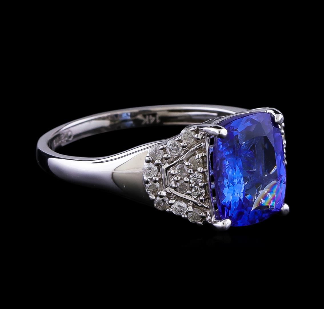 One electronically tested 14KT white gold ladies cast tanzanite and diamond ring with a bright polish finish. The featured tanzanite is set within a stylized diamond bezel supported by diamond set split shoulders, completed by a one and one-half millimeter wide band. Trademark is Orianne. Identified with markings of "14K". Condition is new, good workmanship. Containing: One prong set rectangular cushion mixed cut natural tanzanite approximate weight of 2.66ct., clarity is slightly included, type I, medium dark, very slightly grayish, violetish blue color, (GIA vB 6/3), cut is good. Transmitting light with a minimum of distortion, transparent. Naturally occurring internal & external characteristics are present. Graded in the setting. Tanzanite is a very rare gemstone that is only found in the country of Tanzania. Originally discovered in 1967. Tiffany & Company, named the stone Tanzanite. It is found in the Usumburu Mountains that border the Umba Valley of northern Tanzania. Tanzanite occurs in gray, brown, violet, blue, reddish-purple, & green. The gem is interesting because of its exceptional pleochroism. Rotated in different directions a tanzanite will exhibit multiple changes of color. Tanzanite has a low tolerance to ultrasonic cleaning, and should not be cleaned using this method. Forty-Eight prong set round brilliant cut diamonds approximate total weight of 48 Stones = 0.45ct. Graded in the setting. Clarity: I-1 to I-3. Color: H - J. Total Weight of Colored Stones 2.66ct. Total Weight of Diamonds 0.45ct. Total Weight of Ring 3.15gm. AIG Appraised at $6,870.00.