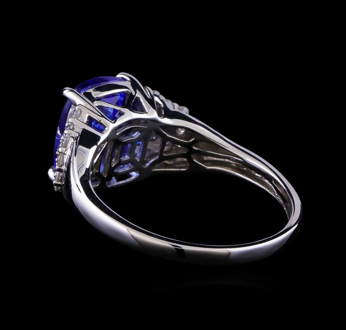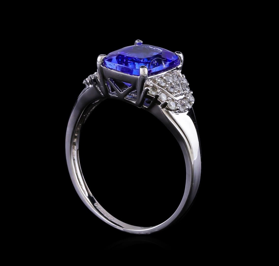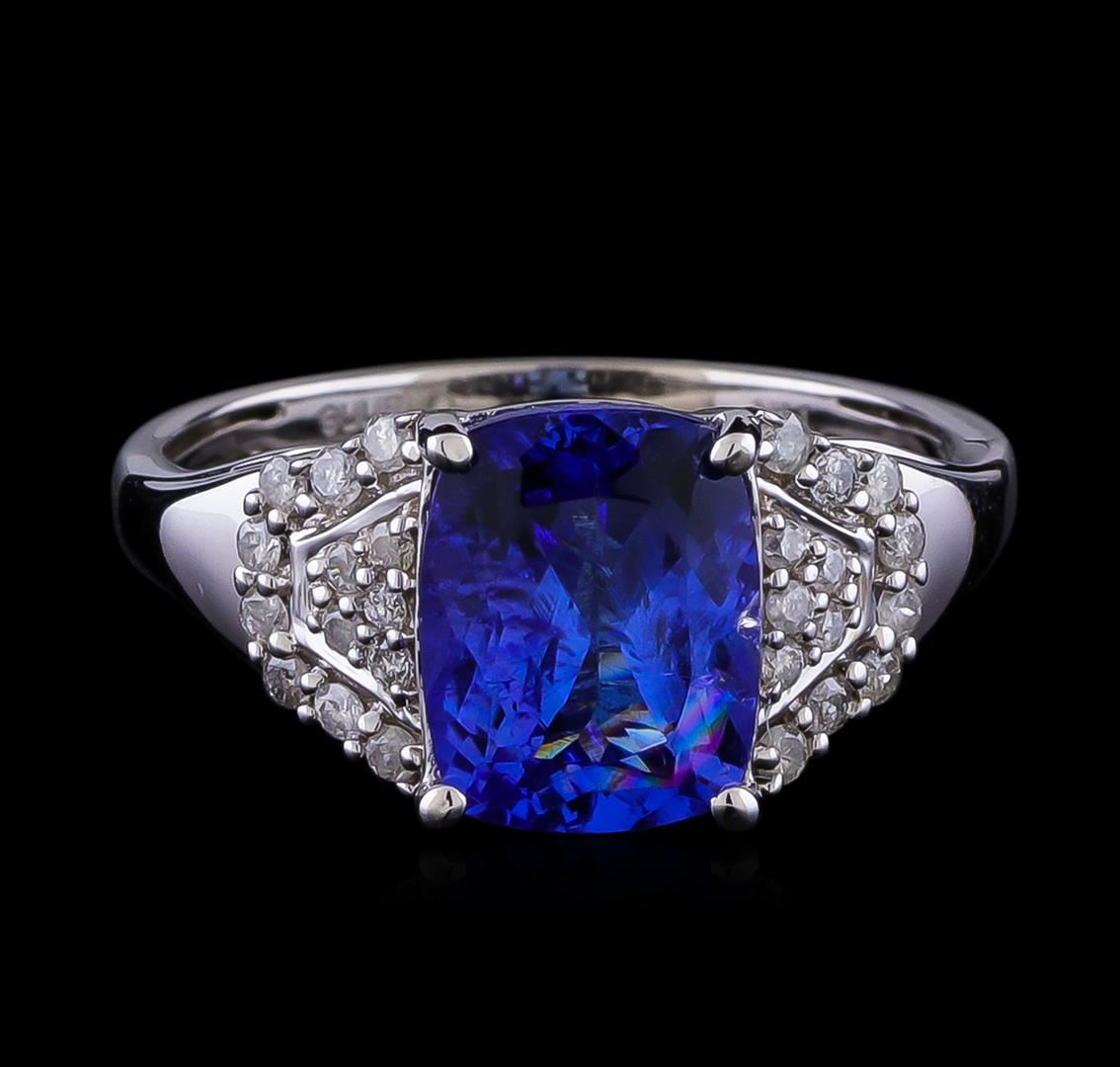 One electronically tested 14KT white gold ladies cast tanzanite and diamond ring with a bright polish finish. The featured tanzanite is set within a stylized diamond bezel supported by diamond set split shoulders, completed by a one and one-half millimeter wide band. Trademark is Orianne. Identified with markings of "14K". Condition is new, good workmanship. Containing: One prong set rectangular cushion mixed cut natural tanzanite approximate weight of 2.66ct., clarity is slightly included, type I, medium dark, very slightly grayish, violetish blue color, (GIA vB 6/3), cut is good. Transmitting light with a minimum of distortion, transparent. Naturally occurring internal & external characteristics are present. Graded in the setting. Tanzanite is a very rare gemstone that is only found in the country of Tanzania. Originally discovered in 1967. Tiffany & Company, named the stone Tanzanite. It is found in the Usumburu Mountains that border the Umba Valley of northern Tanzania. Tanzanite occurs in gray, brown, violet, blue, reddish-purple, & green. The gem is interesting because of its exceptional pleochroism. Rotated in different directions a tanzanite will exhibit multiple changes of color. Tanzanite has a low tolerance to ultrasonic cleaning, and should not be cleaned using this method. Forty-Eight prong set round brilliant cut diamonds approximate total weight of 48 Stones = 0.45ct. Graded in the setting. Clarity: I-1 to I-3. Color: H - J. Total Weight of Colored Stones 2.66ct. Total Weight of Diamonds 0.45ct. Total Weight of Ring 3.15gm. AIG Appraised at $6,870.00.