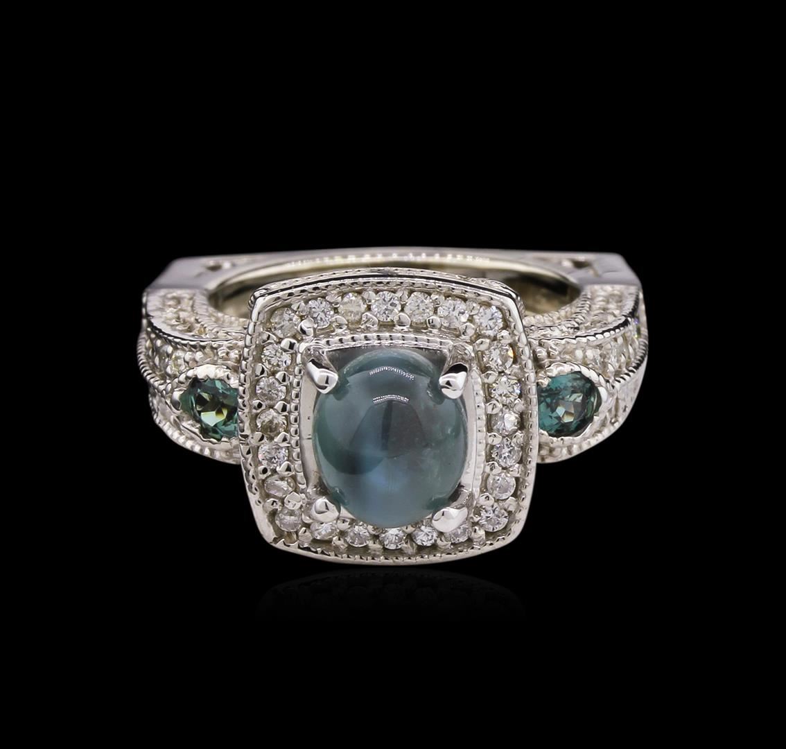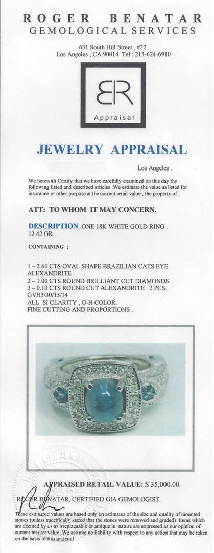 One 18KT White Gold ring. 12.42 GR. Containing: 2.66 CTS oval shape Brazilian cats eye alexandrite. 1.00 CTS round brilliant cut diamonds. 0.10 CTS round cut alexandrite. All SI Clarity, G-H Color Fine Cutting and Proportions. RBGS Appraised at $35,000.00.