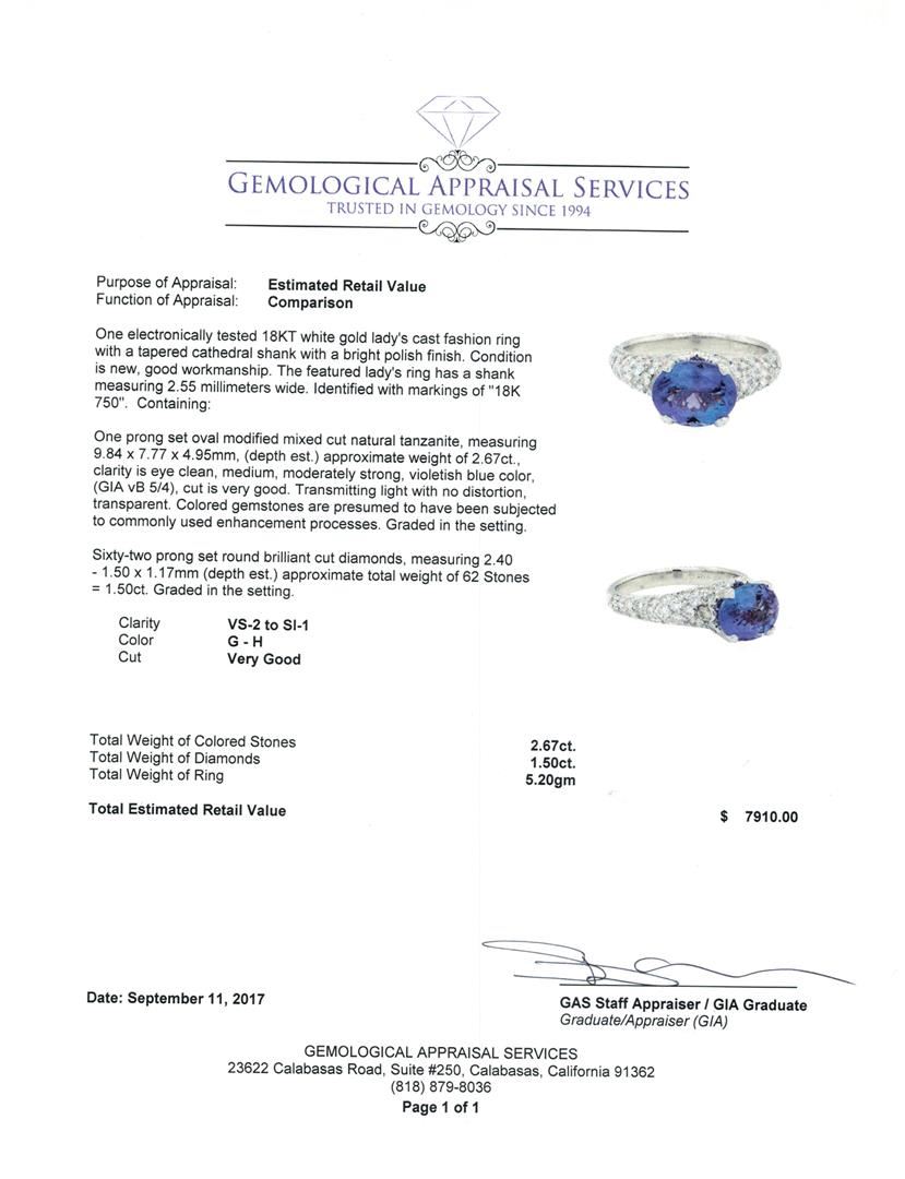 One electronically tested 18KT white gold lady's cast fashion ring with a tapered cathedral shank with a bright polish finish. The featured lady's ring has a shank measuring 2.55 millimeters wide. Identified with markings of '18K 750'. Condition is new, good workmanship. Containing: One prong set oval modified mixed cut natural tanzanite, measuring 9.84 x 7.77 x 4.95mm, (depth est.) approximate weight of 2.67ct., clarity is eye clean, medium, moderately strong, violetish blue color, (GIA vB 5/4), cut is very good. Transmitting light with no distortion, transparent. Colored gemstones are presumed to have been subjected to commonly used enhancement processes. Graded in the setting. Sixty-Two prong set round brilliant cut diamonds, measuring 2.40 - 1.50 x 1.17mm (depth est.) approximate total weight of 62 Stones = 1.50ct. Graded in the setting. Color G - H Clarity VS-2 to SI-1 Cut Very Good. Total Weight of Colored Stones 2.67ct.. Total Weight of Diamonds 1.50ct.. Total Weight of Ring 5.20gm GAS Appraised at $7910.00. GAS Appraised at $7,910.00.