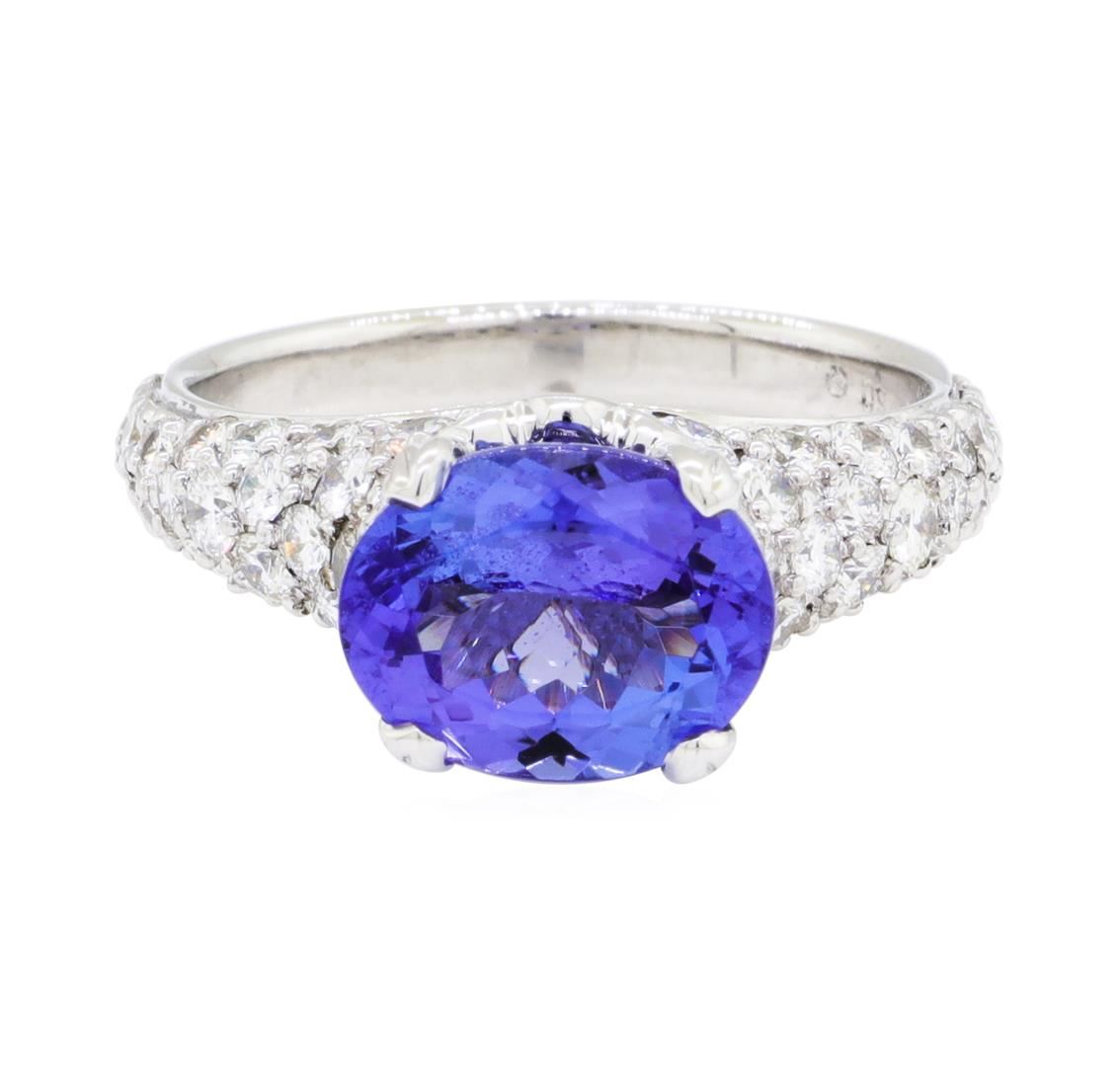 One electronically tested 18KT white gold lady's cast fashion ring with a tapered cathedral shank with a bright polish finish. The featured lady's ring has a shank measuring 2.55 millimeters wide. Identified with markings of '18K 750'. Condition is new, good workmanship. Containing: One prong set oval modified mixed cut natural tanzanite, measuring 9.84 x 7.77 x 4.95mm, (depth est.) approximate weight of 2.67ct., clarity is eye clean, medium, moderately strong, violetish blue color, (GIA vB 5/4), cut is very good. Transmitting light with no distortion, transparent. Colored gemstones are presumed to have been subjected to commonly used enhancement processes. Graded in the setting. Sixty-Two prong set round brilliant cut diamonds, measuring 2.40 - 1.50 x 1.17mm (depth est.) approximate total weight of 62 Stones = 1.50ct. Graded in the setting. Color G - H Clarity VS-2 to SI-1 Cut Very Good. Total Weight of Colored Stones 2.67ct.. Total Weight of Diamonds 1.50ct.. Total Weight of Ring 5.20gm GAS Appraised at $7910.00. GAS Appraised at $7,910.00.