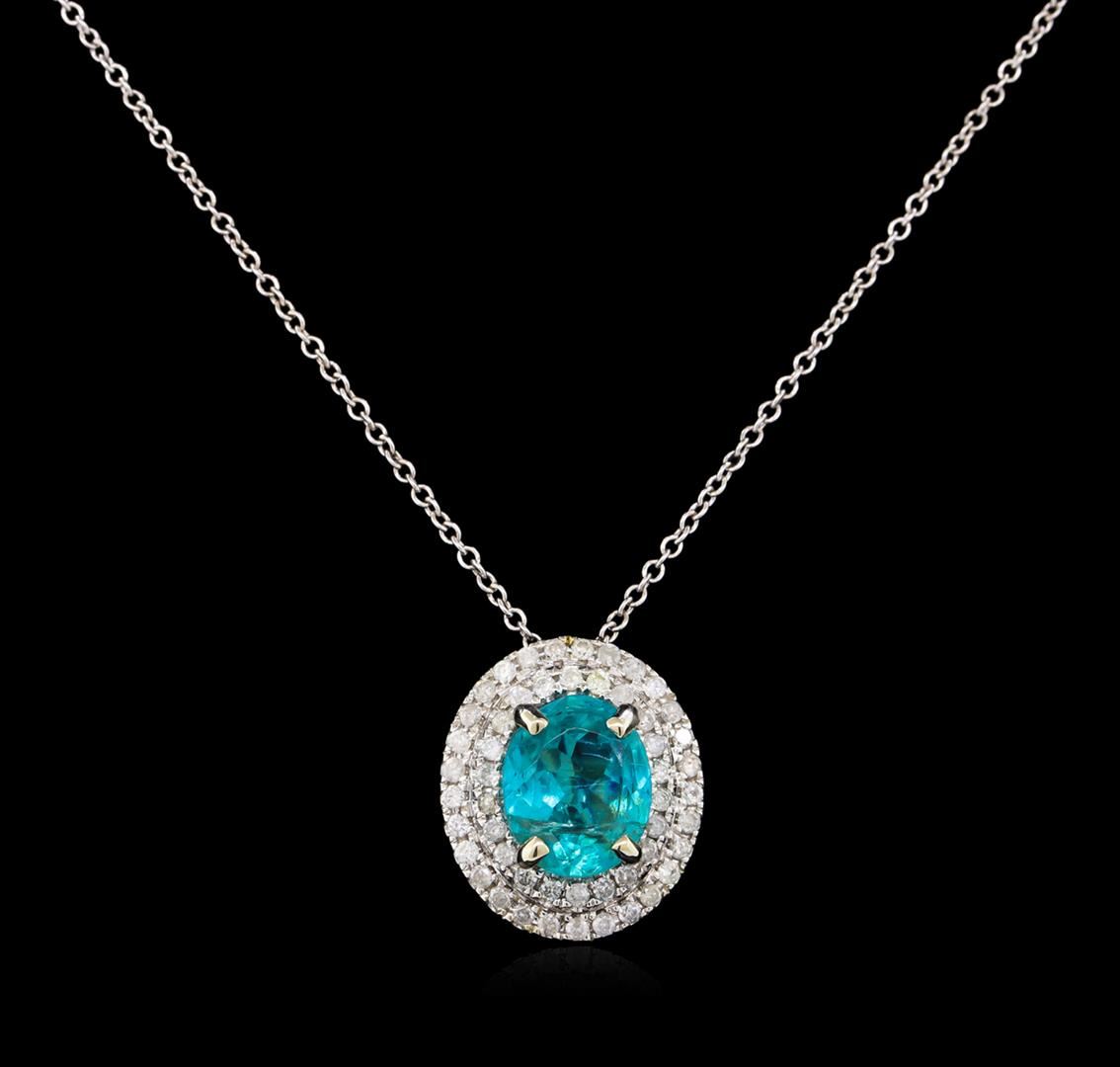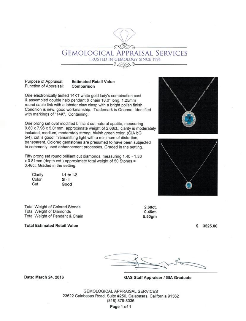 One electronically tested 14KT white gold lady's combination cast & assembled double halo pendant & chain 18.0" long, 1.25mm round cable link with a lobster claw clasp with a bright polish finish. Trademark is Orianne. Identified with markings of "14K". Condition is new, good workmanship. Containing: One prong set oval modified brilliant cut natural apatite, measuring 9.80 x 7.96 x 5.01mm, approximate weight of 2.68ct., clarity is moderately included, medium, moderately strong, bluish green color, (GIA bG 5/4), cut is good. Transmitting light with a minimum of distortion, transparent. Colored gemstones are presumed to have been subjected to commonly used enhancement processes. Graded in the setting. Fifty prong set round brilliant cut diamonds, measuring 1.40 - 1.30 x 0.81mm (depth est.) approximate total weight of 50 Stones = 0.46ct. Graded in the setting. Clarity: I-1 to I-2. Color: G - I. Cut Good. Total Weight of Colored Stones 2.68ct. Total Weight of Diamonds 0.46ct. Total Weight of Pendant & Chain 5.50gm. GAS Appraised at $3,525.00.