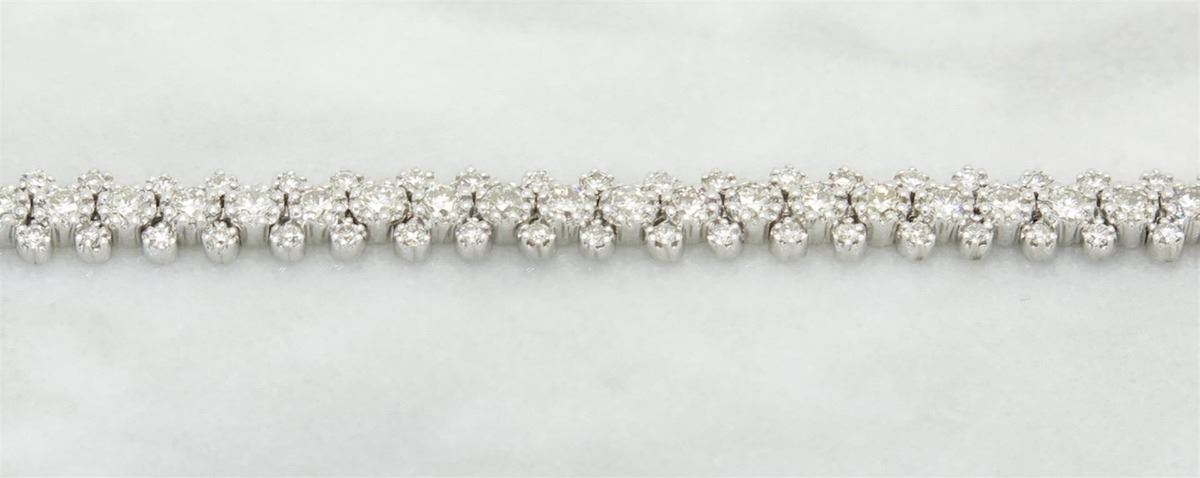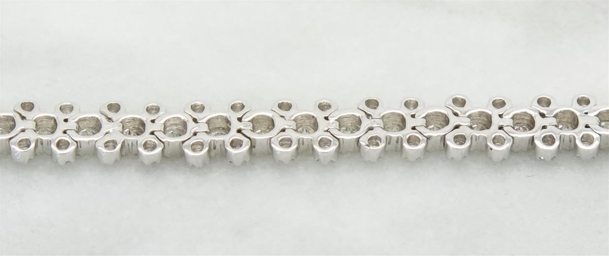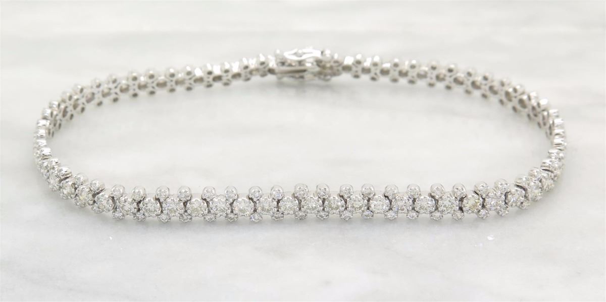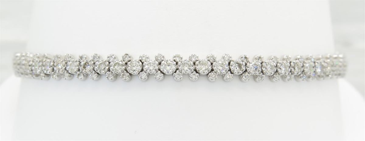 One tested 18K white gold diamond bracelet. Containing: 192 Round Brilliant Cut Diamonds. Clarity: I-VS, Color: G-I. Approximate total diamond weight: 2.68CTW. All diamonds are graded in the mounting unless otherwise stated. Weight of bracelet: 8.9 grams, Size: 7" long.