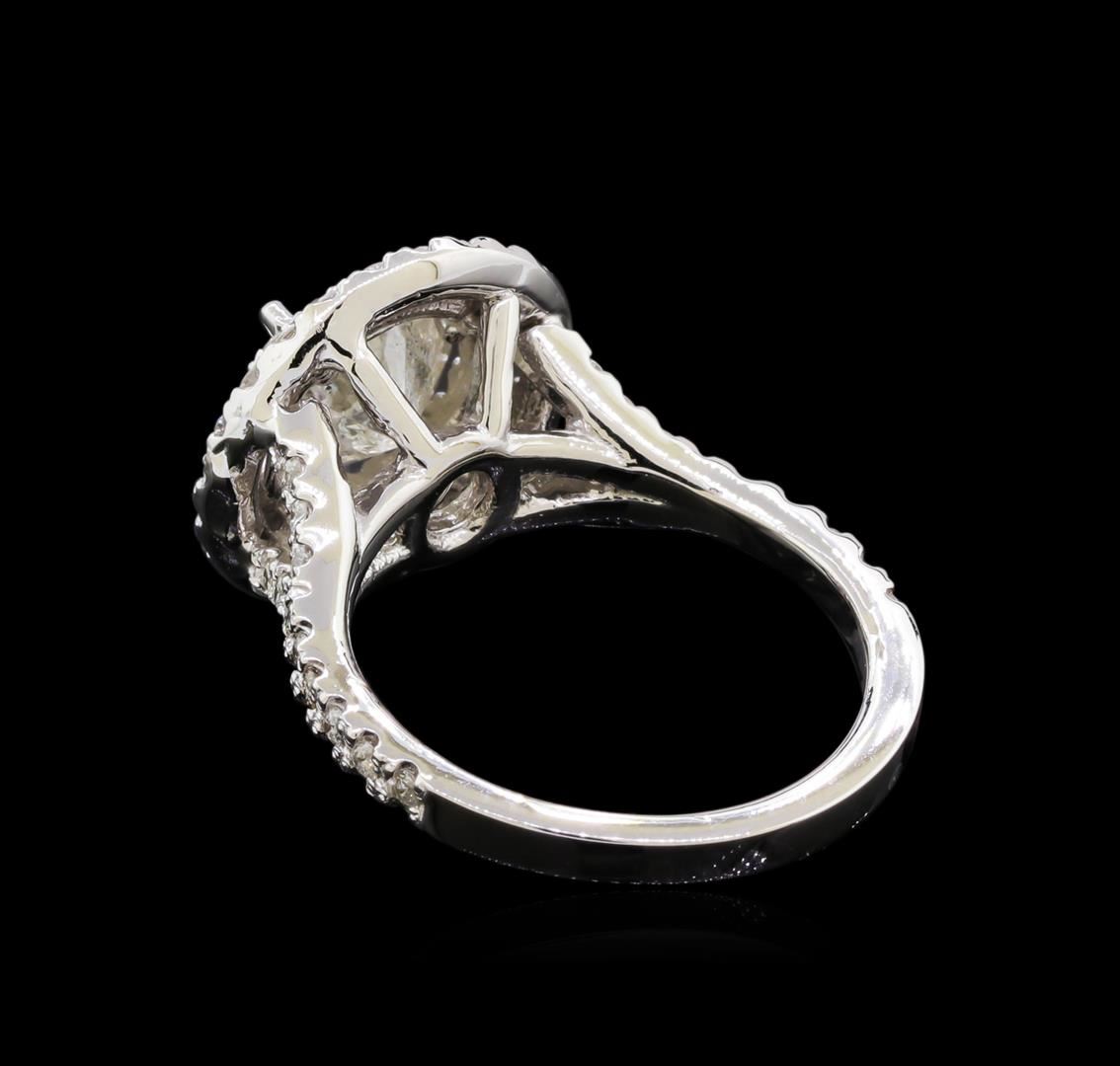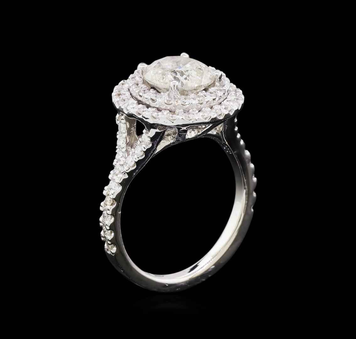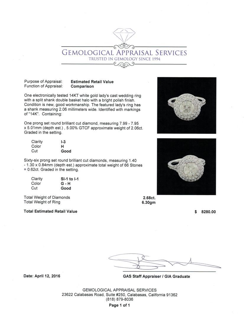 One electronically tested 14KT white gold lady's cast wedding ring with a split shank double basket halo with a bright polish finish. The featured lady's ring has a shank measuring 2.06 millimeters wide. Identified with markings of "14K". Condition is new, good workmanship. Containing: One prong set round brilliant cut diamond, measuring 7.99 - 7.95 x 5.01mm (depth est.) , 5.00.%. GTCF approximate weight of 2.06ct. Graded in the setting. Clarity: I-3. Color: Good Sixty-Six prong set round brilliant cut diamonds, measuring 1.40 - 1.30 x 0.84mm (depth est.) approximate total weight of 66 Stones = 0.62ct. Graded in the setting. Clarity: SI-1 to I-1. Color: G - Good. Total Weight of Diamonds 2.68ct. Total Weight of Ring 6.30gm. GAS Appraised at $8,280.00.