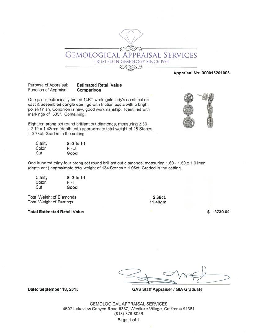 One pair electronically tested 14KT white gold lady's combination cast & assembled dangle earrings with friction posts with a bright polish finish. Identified with markings of "585". Condition is new, good workmanship. Containing: Eighteen prong set round brilliant cut diamonds, measuring 2.30 - 2.10 x 1.43mm (depth est.) approximate total weight of 18 Stones = 0.73ct. Graded in the setting. Clarity: SI-2 to I-1. Color: H - Good One Hundred Thirty-Four prong set round brilliant cut diamonds, measuring 1.60 - 1.50 x 1.01mm (depth est.) approximate total weight of 134 Stones = 1.95ct. Graded in the setting. Clarity: SI-2 to I-1. Color: H - I. Cut Good. Total Weight of Diamonds 2.68ct. Total Weight of Earrings 11.40gm. GAS Appraised at $8,730.00.