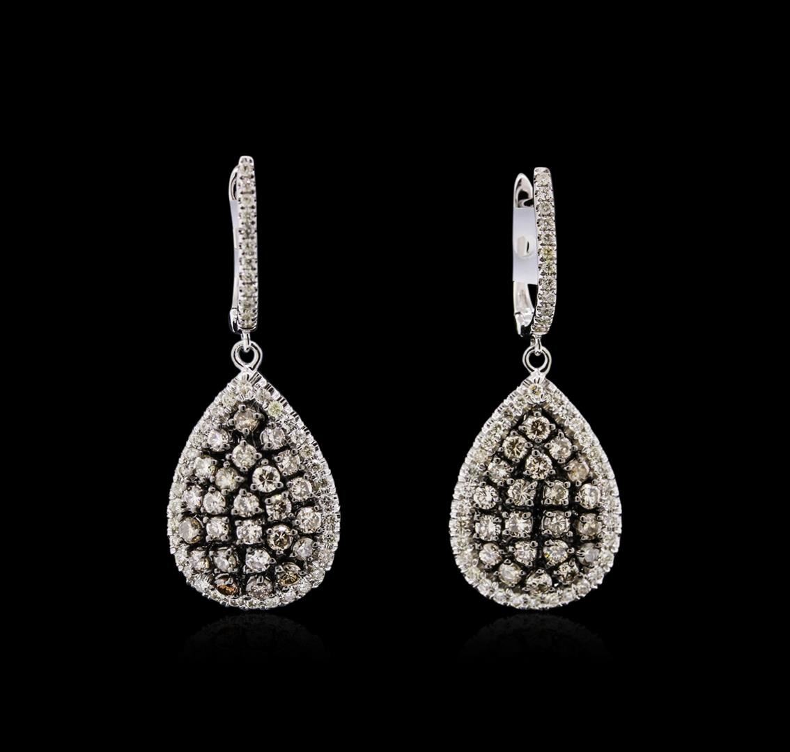 One pair electronically tested 14KT white gold lady's combination cast & assembled dangle earring with hinged, snap locking posts with a bright polish finish. Identified with markings of "14K". Condition is new, good workmanship. Containing: Forty-Two prong set round brilliant cut diamonds, measuring 2.40 - 2.30 x 1.60mm (depth est.) approximate total weight of 42 Stones = 2.27ct. Colored gemstones are presumed to have been subjected to commonly used enhancement processes. Graded in the setting. Clarity SI-2 to I-1 Cut Good Sixty-Four split prong set round brilliant cut diamonds, measuring 1.30 - 1.10 x 0.72mm (depth est.) approximate total weight of 64 Stones = 0.41ct. Graded in the setting. Clarity SI-2 to I-1 Color H - Good Total Weight of Diamonds 2.68ct. Total Weight of Earring 8.50gm GAS Appraised at $10,595.00.