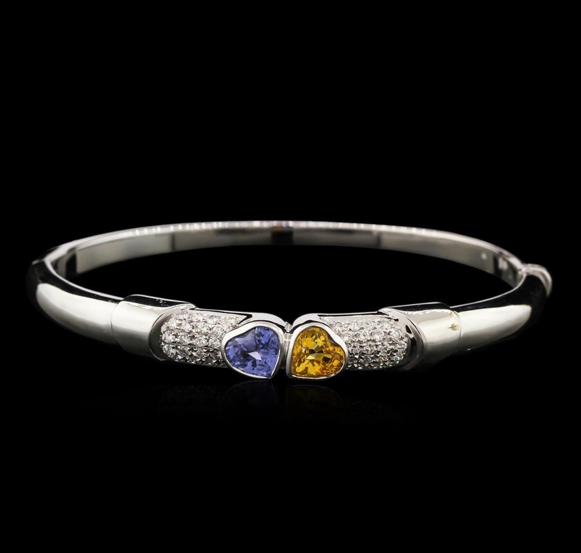 One electronically tested 18KT white gold ladies cast sapphire and diamond bangle bracelet with a hidden box clasp with a bright polish finish. Identified with markings of "750". Condition is new. Containing: One bezel set heart modified brilliant cut natural yellow sapphire, measuring 7.20 x 6.80 x 4.42mm, approximate total weight of 1.34ct., clarity is moderately included, type II, medium light, brownish, yellow color, (GIA Y 4/3), cut is good. One bezel set triangle modified brilliant cut natural blue sapphire, measuring 7.20 x 6.80 x 4.42mm, approximate weight of 1.34ct., clarity is slightly included, type II, medium light, very slightly grayish, bluish violet color, (GIA bV 4/3), cut is good. Forty prong set round brilliant cut diamonds, measuring 1.90 - 1.30 x 0.96mm (depth est.) approximate total weight of 40 Stones = 0.63ct. Clarity: SI-1. Color: G - H, Cut is Good. Colored gemstones are presumed to have been subjected to commonly used enhancement processes. All diamonds and colored gemstones are graded in the mounting, unless otherwise stated. Total Weight of Colored Stones 2.68ct. Total Weight of Diamonds 0.63ct. Total Weight of Bangle Bracelet 24.70 grams. GGL Appraised at $6,740.00.