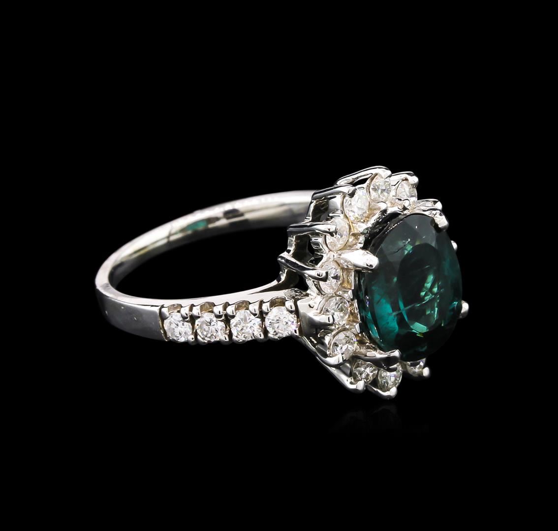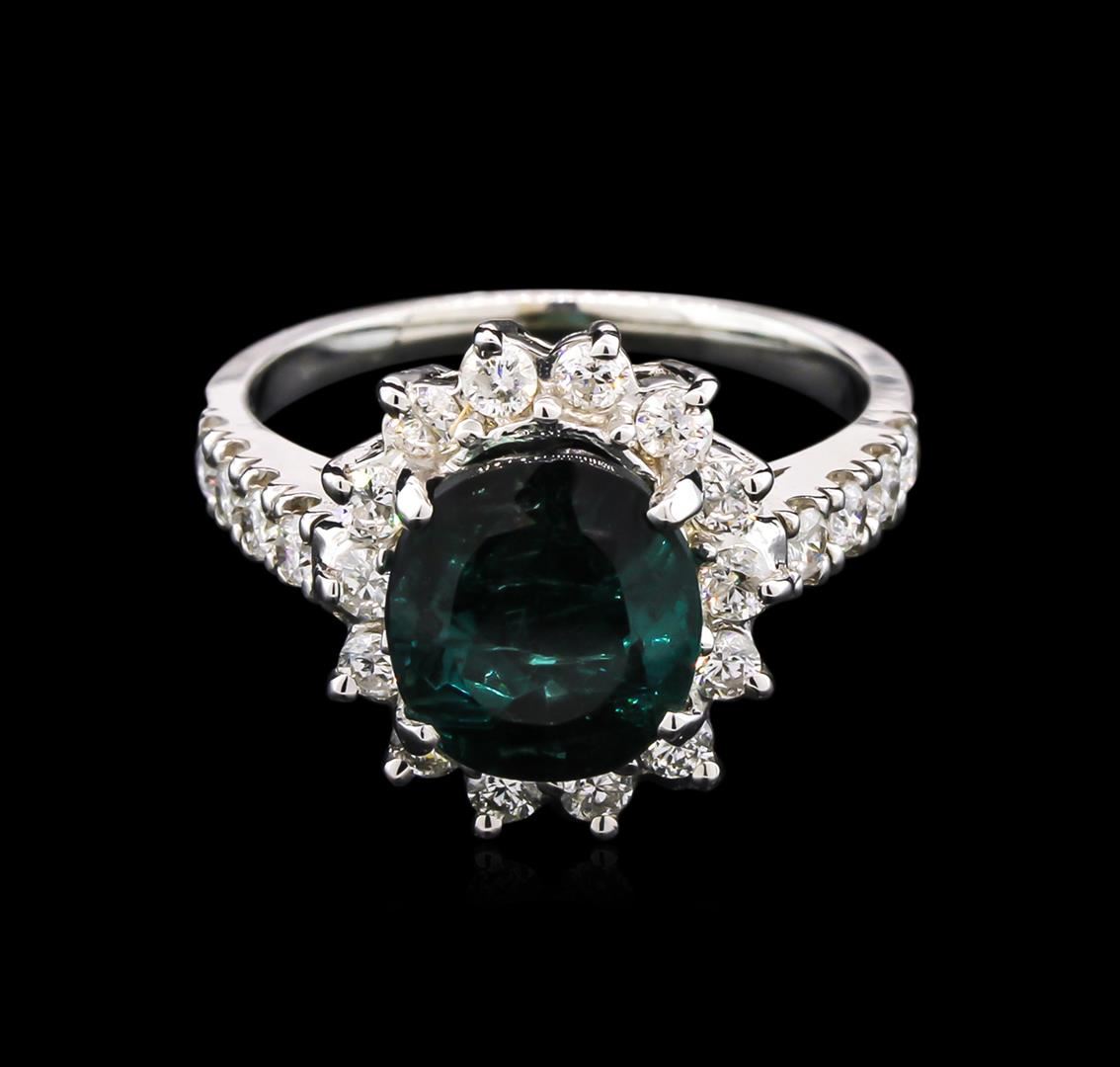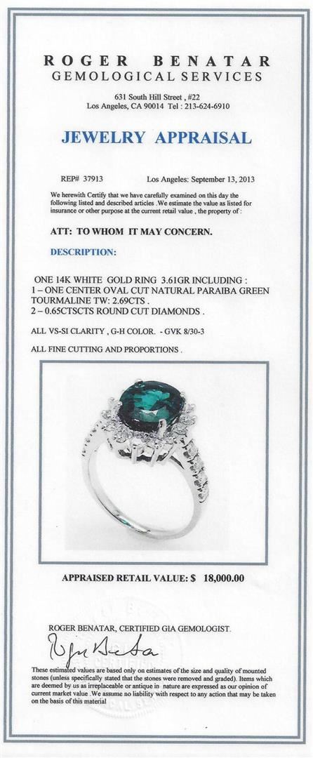 One 14KT white gold ring weighing 3.61 grams containing: 1 center oval cut natural green tourmaline with a total approximate weight of 2.69ct and round cut diamonds with a total approximate weight of 0.65ct. Diamonds: All VS-SI clarity; G-H color. Fine cutting/proportions. RBGS Appraised at $18,000.00.