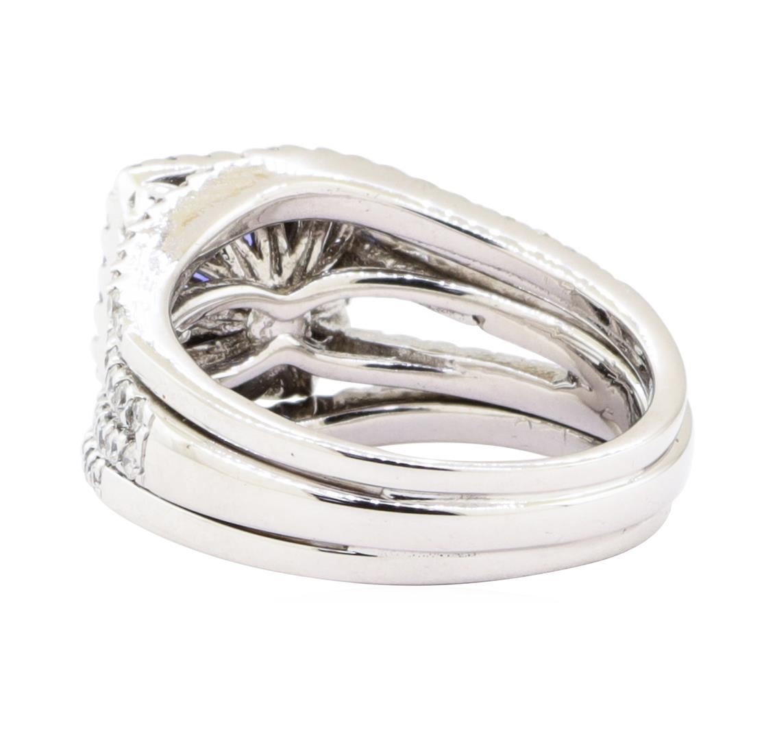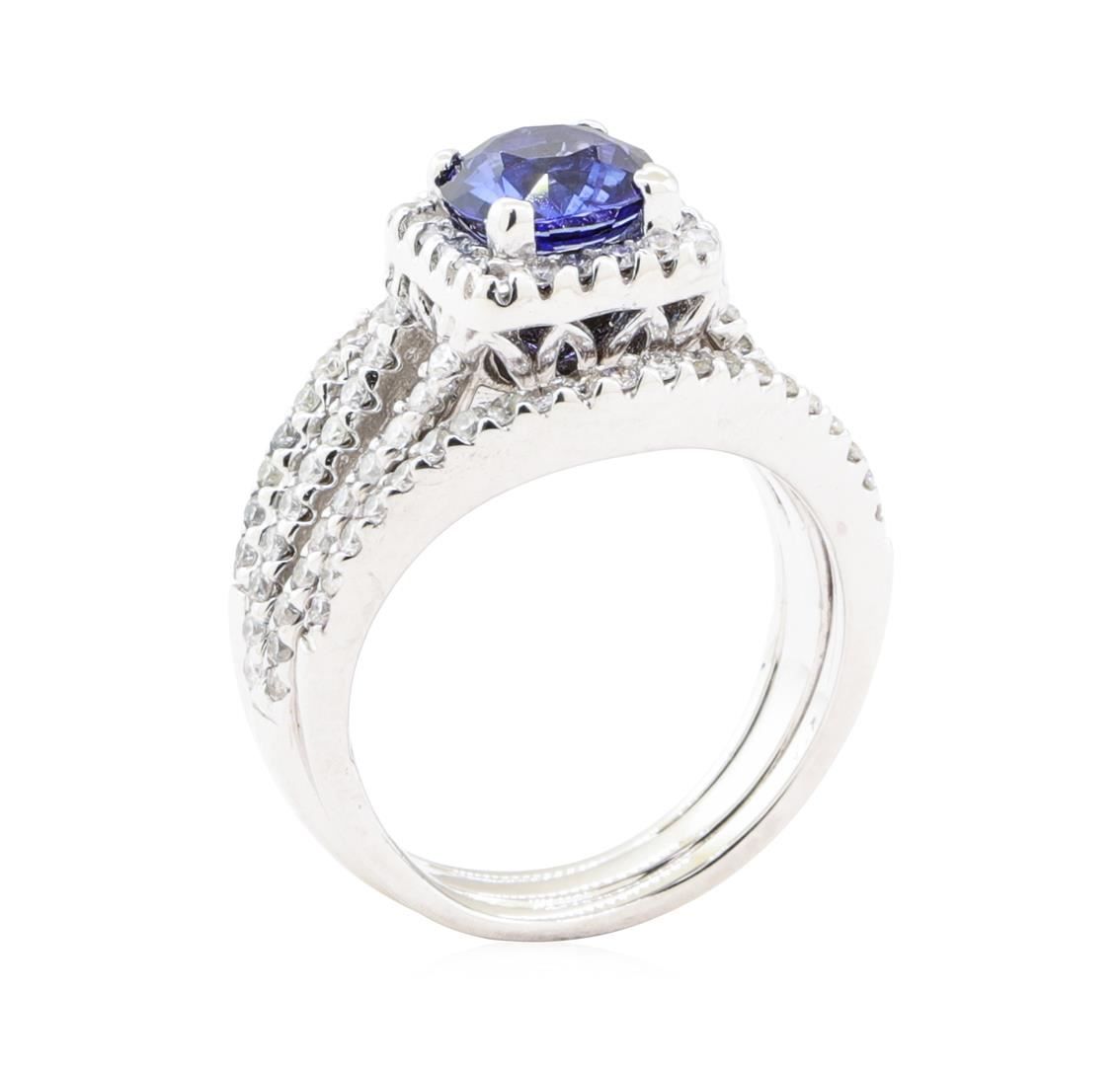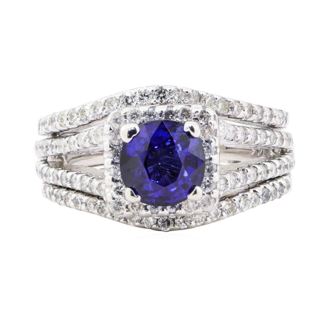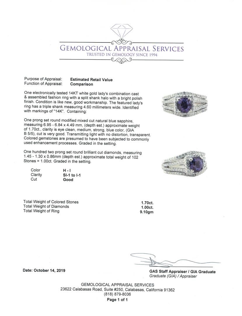 One electronically tested 14KT white gold lady's combination cast & assembled fashion ring with a split shank halo with a bright polish finish. The featured lady's ring has a triple shank measuring 4.60 millimeters wide. Identified with markings of '14K'. Condition is Good. Containing: One prong set round modified mixed cut natural blue sapphire, measuring 6.95 - 6.84 x 4.49 mm, (depth est.) approximate weight of 1.70 ct., clarity is eye clean, medium, strong, blue color, (GIA B 5/5), cut is very good. Transmitting light with no distortion, transparent. Colored gemstones are presumed to have been subjected to commonly used enhancement processes. Graded in the setting. One Hundred Two prong set round brilliant cut diamonds, measuring 1.45 - 1.30 x 0.86mm (depth est.) approximate total weight of 102 Stones = 1.00 ct. Graded in the setting. Color H - I Clarity SI-1 to I-1 Cut Good. Total Weight of Colored Stones 1.70 ct.. Total Weight of Diamonds 1.00 ct.. Total Weight of Ring 9.10gm GAS Appraised at $6765.00. GAS Appraised.