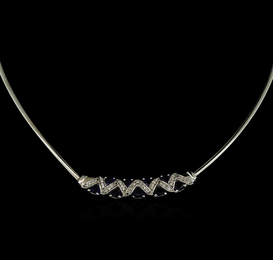 One electronically tested 14KT white gold ladies cast & assembled sapphire and diamond necklace. The sixteen inch length necklace features series of sapphires set around a folding diamond ribbon, supported by a 14KT white gold omega chain, terminating in a plunge style clasp with safety. Bright polish finish. Identified with markings of '14K'. Condition is good. Containing: Nine prong set triangle mixed cut natural blue sapphires, measuring 4.00 x 4.00 x 2.60mm, approximate total weight of 2.70ct., clarity is eye clean, type II, dark, very slightly grayish, blue color, (GIA B 7/3), cut is good. Transmitting light with no distortion, transparent. Measurements & the color grade are an average for the group. Graded in the setting. Forty-One prong set round brilliant cut diamonds, measuring 1.40 - 1.30 x 0.81mm (depth est.) approximate total weight of 41 Stones = 0.40ct. Graded in the setting. Clarity SI-1 to SI-2. Color: G - I. Total Weight of Colored Stones 2.70ct.. Total Weight of Diamonds 0.40ct.. Total Weight of Necklace 14.72gm. AIG Appraised at $4,935.00.