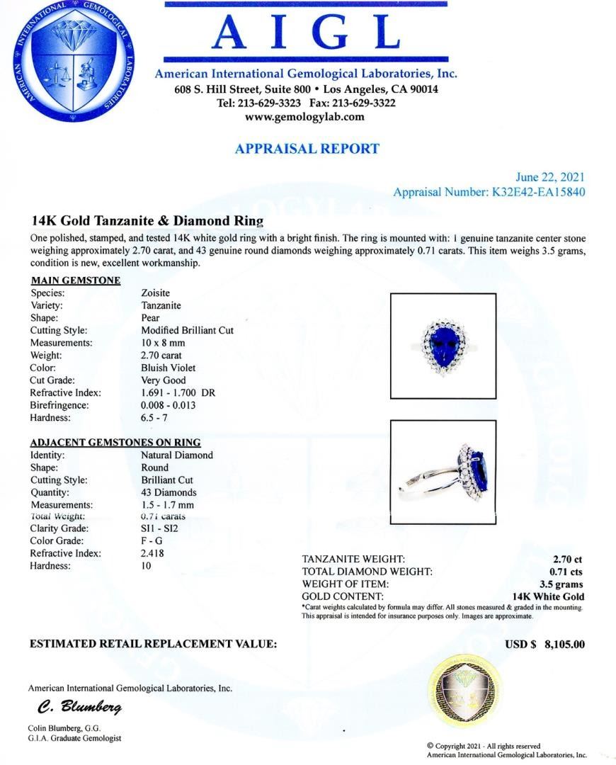 One polished, stamped, and tested 14K white gold ring with a bright finish. The ring is mounted with: 1 genuine tanzanite center stone weighing approximately 2.70 carat, and 43 genuine round diamonds weighing approximately 0.71 carats. This item weighs 3.5 grams, condition is new, excellent workmanship. MAIN GEMSTONE Species: Zoisite Variety: Tanzanite Shape: Pear Cutting Style: Modified Brilliant Cut Measurements: 10 x 8mm Weight: 2.70 carat Color: Bluish Violet Cut Grade: Very Good Refractive Index: 1.691 - 1.700 DR Birefringence: 0.008 - 0.013 Hardness: 6.5 - 7 ADJACENT GEMSTONES ON RING Identity: Natural Diamond Shape: Round Cutting Style: Brilliant Cut Quantity: 43 Diamonds Measurements: 1.5 - 1.7mm Total Weight: 0.71 carats Clarity Grade: SI1 to SI2 Color Grade: F - G Refractive Index: 2.418 Hardness: 10 TANZANITE WEIGHT: 2.70ct TOTAL DIAMOND WEIGHT: 0.71ctw WEIGHT OF ITEM: 3.5 grams GOLD CONTENT: 14K White Gold #Size: 6 3/4