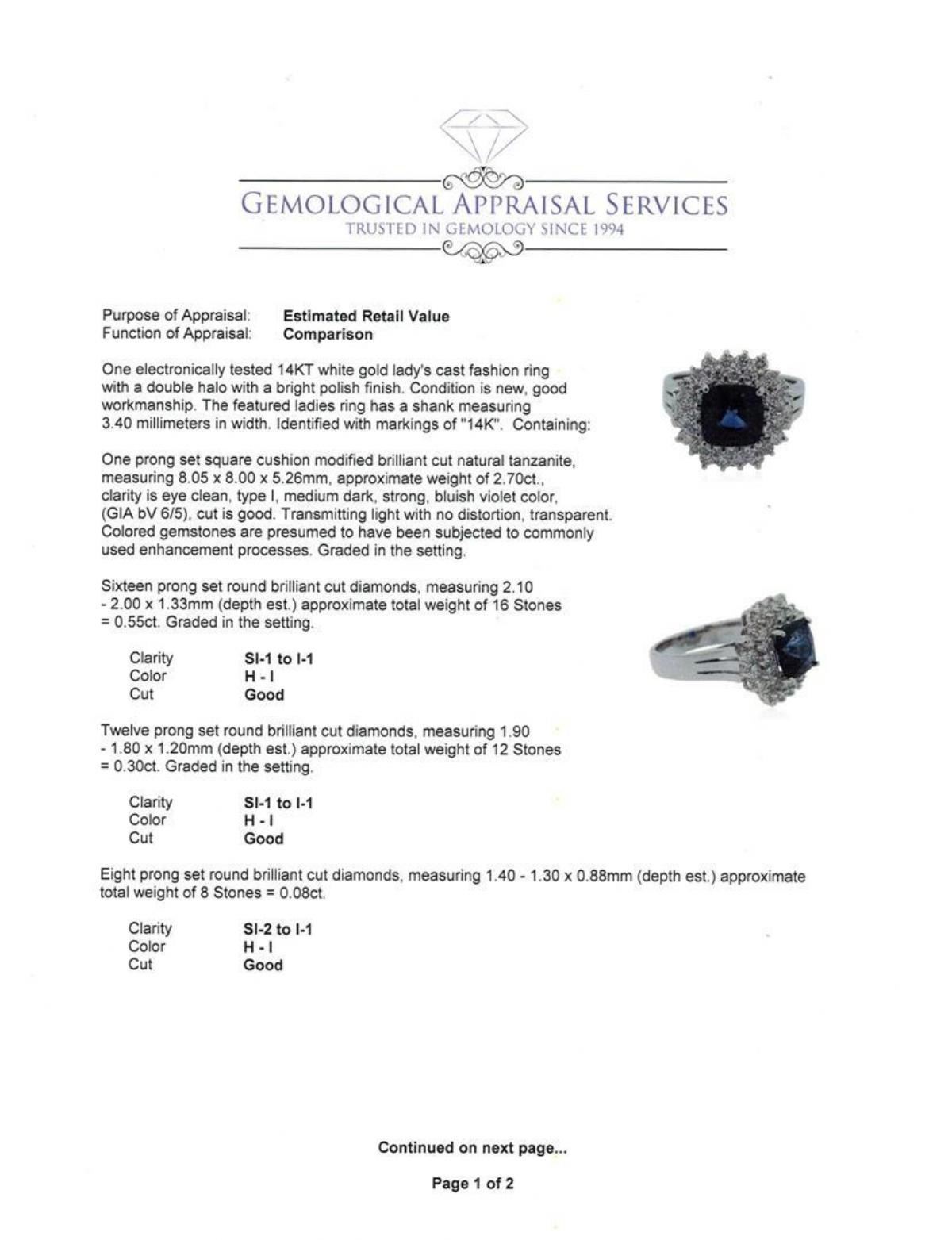 One electronically tested 14KT white gold lady's cast fashion ring with a double halo with a bright polish finish. The featured ladies ring has a shank measuring 3.40 millimeters in width. Identified with markings of "14K". Condition is new, good workmanship. Containing: One prong set square cushion modified brilliant cut natural tanzanite, measuring 8.05 x 8.00 x 5.26mm, approximate weight of 2.70 ct., clarity is eye clean, type I, medium dark, strong, bluish violet color, (GIA bV 6/5), cut is good. Transmitting light with no distortion, transparent. Colored gemstones are presumed to have been subjected to commonly used enhancement processes. Graded in the setting. Sixteen prong set round brilliant cut diamonds, measuring 2.10 - 2.00 x 1.33mm (depth est.) approximate total weight of 16 Stones = 0.55ct. Graded in the setting. Clarity: SI-1 to I-1. Color: H - I. Cut Good Twelve prong set round brilliant cut diamonds, measuring 1.90 - 1.80 x 1.20mm (depth est.) approximate total weight of 12 Stones = 0.30 ct. Graded in the setting. Clarity: SI-1 to I-1. Color: H - I. Cut Good Eight prong set round brilliant cut diamonds, measuring 1.40 - 1.30 x 0.88mm (depth est.) approximate total weight of 8 Stones = 0.08ct. Clarity: SI-2 to I-1. Color: H - I. Cut Good. Total Weight of Colored Stones 2.70 ct. Total Weight of Diamonds 0.93ct. Total Weight of Ring 7.00gm. GAS Appraised.