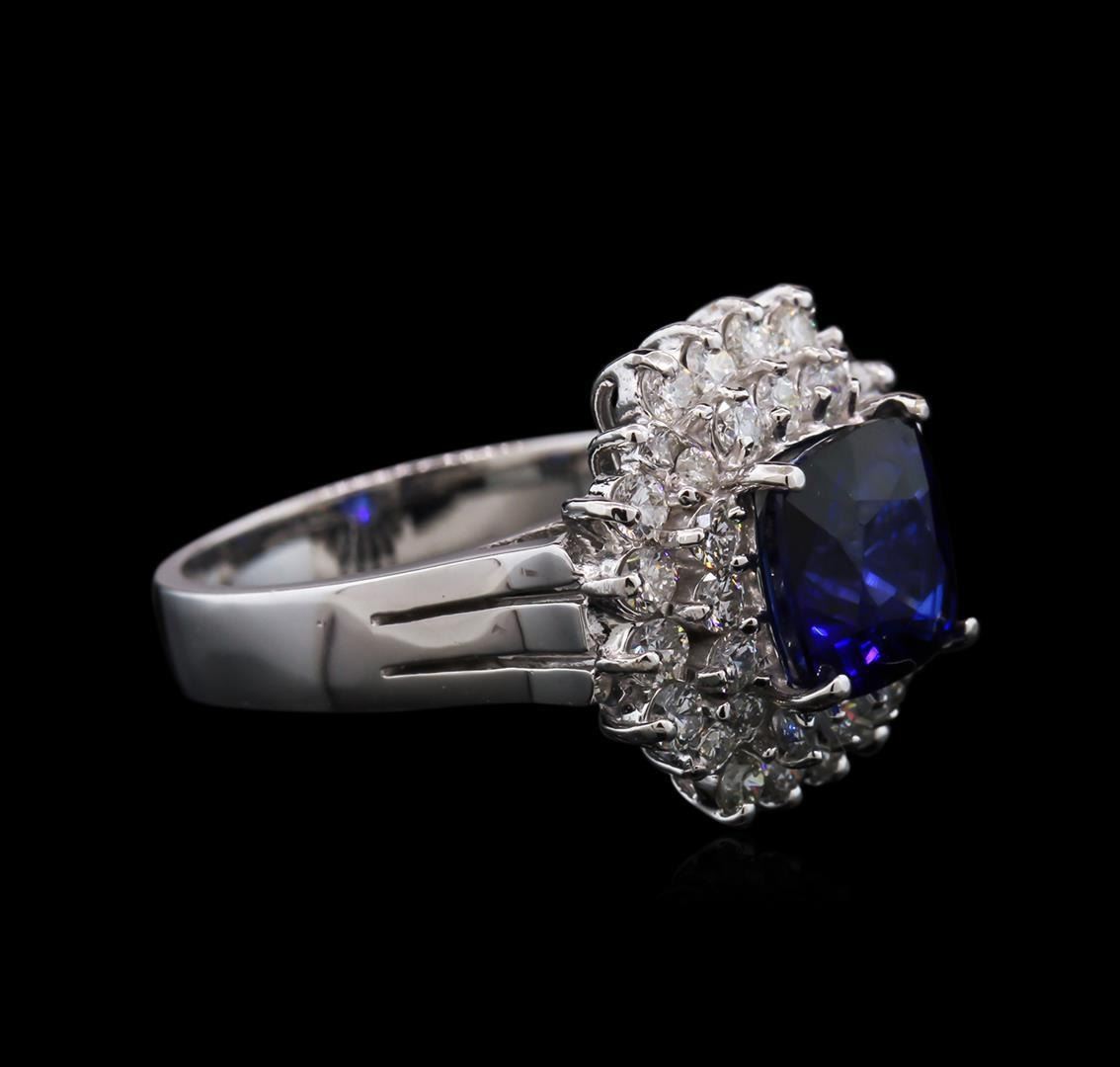 One electronically tested 14KT white gold lady's cast fashion ring with a double halo with a bright polish finish. The featured ladies ring has a shank measuring 3.40 millimeters in width. Identified with markings of "14K". Condition is new, good workmanship. Containing: One prong set square cushion modified brilliant cut natural tanzanite, measuring 8.05 x 8.00 x 5.26mm, approximate weight of 2.70 ct., clarity is eye clean, type I, medium dark, strong, bluish violet color, (GIA bV 6/5), cut is good. Transmitting light with no distortion, transparent. Colored gemstones are presumed to have been subjected to commonly used enhancement processes. Graded in the setting. Sixteen prong set round brilliant cut diamonds, measuring 2.10 - 2.00 x 1.33mm (depth est.) approximate total weight of 16 Stones = 0.55ct. Graded in the setting. Clarity: SI-1 to I-1. Color: H - I. Cut Good Twelve prong set round brilliant cut diamonds, measuring 1.90 - 1.80 x 1.20mm (depth est.) approximate total weight of 12 Stones = 0.30 ct. Graded in the setting. Clarity: SI-1 to I-1. Color: H - I. Cut Good Eight prong set round brilliant cut diamonds, measuring 1.40 - 1.30 x 0.88mm (depth est.) approximate total weight of 8 Stones = 0.08ct. Clarity: SI-2 to I-1. Color: H - I. Cut Good. Total Weight of Colored Stones 2.70 ct. Total Weight of Diamonds 0.93ct. Total Weight of Ring 7.00gm. GAS Appraised.