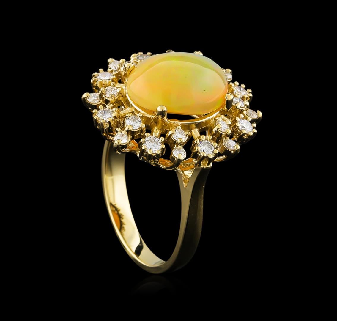 One electronically tested 14KT yellow gold lady's cast fashion ring with a basket double halo with a bright polish finish. The featured lady's ring has a shank measuring 2.61 millimeters wide. Identified with markings of "K14". Condition is new, good workmanship. Containing: One orange crystal that is cut in a oval shaped cabochon and is prong set, measuring 11.97 mm long x 9.81 mm wide, and 4.98 mm thick and the approximate weight is 2.70 carats. The opal has a somewhat bright, green-orange play of color (fire) in a rolling flashfire pattern; a medium dome; a good cut; no inclusions; consistent in its brightness and pattern; and is not directional. Graded in the setting. Eight prong set round brilliant cut diamonds, measuring 2.20 - 2.15 x 1.36mm (depth est.) approximate total weight of 8 Stones = 0.32ct. Graded in the setting. Clarity: SI-1 to SI-2. Color: G - Very Good Sixteen prong set round brilliant cut diamonds, measuring 1.80 - 1.60 x 1.05mm (depth est.) approximate total weight of 16 Stones = 0.31ct. Graded in the setting. Clarity: SI-1 to I-1. Color: H - I. Cut Good. Total Weight of Diamonds 0.63ct. Total Weight of Opals 2.70ct. Total Weight of Ring 6.00gm. GAS Appraised at $3,210.00.