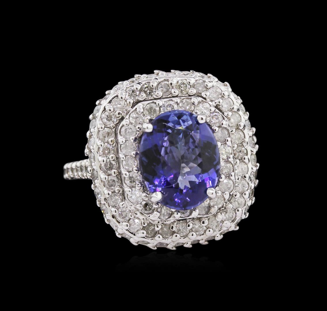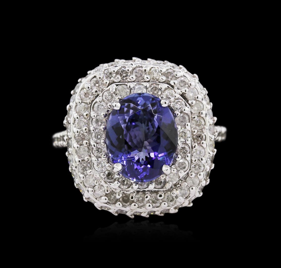 One 14KT white gold tanzanite and diamond ring. An oval cut tanzanite zoisite gemstone is prong mounted in the center of the ring. Round brilliant cut diamonds accent the ring around the center gemstone and on both sides. The ring is cast stamped "14K" and has a gross weight of 9.2 Grams. Diamond(s): Shape: Round Brilliant Cut. Weight: 1.68 carat. Average Clarity: I1. Average Color: H-J. Symmetry: Very Good. Polish: Very Good. GemStone(s): Tanzanite Zoisite. Nature: Natural. Shape: Oval, Faceted. Quantity: 1, Mounted. Weight: 2.70 carat. Dimensions: Length - 10.44 mm. ; Width - 8.43 mm. Bulge: Visible. Clarity: VS, Type 1. Color: Purplish Blue (4/5). Symmetry: Very Good. Color Intensity: Medium. Transparency: Translucent. Tone: Dark. Enhancements: Coated. Metal(s): Metal: Gold, Stamped. Purity: 14K. Color: White. Condition: Excellent. Finish: High polish. GGA Appraised at $7,980.00.