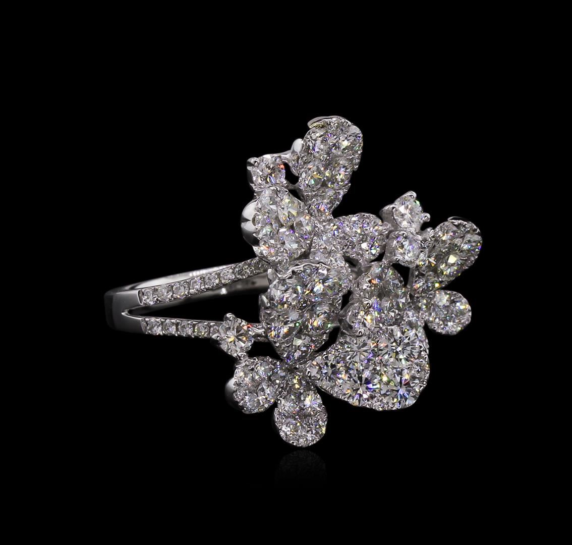 One electronically tested 18KT white gold lady's combination cast & assembled fashion ring with a split shank with a bright polish finish. The featured lady's ring has a triple butterfly motif and shank measuring 2.37 millimeters wide. Trademark is Simon G. Identified with markings of "750". Condition is new, good workmanship. Containing: Sixty-Five prong set round brilliant cut diamonds, measuring 2.30 - 1.80 x 1.23mm (depth est.) approximate total weight of 65 Stones = 2.24ct. Graded in the setting. Clarity: VS-1 to VS-2. Color: G - Very Good Eighty-Four prong set round brilliant cut diamonds, measuring 1.30 - 1.00 x 0.69mm (depth est.) approximate total weight of 84 Stones = 0.46ct. Graded in the setting. Clarity: VS-1 to VS-2. Color: G - Very Good. Total Weight of Diamonds 2.70ct. Total Weight of Ring 7.20gm. GAS Appraised at $12,985.00.