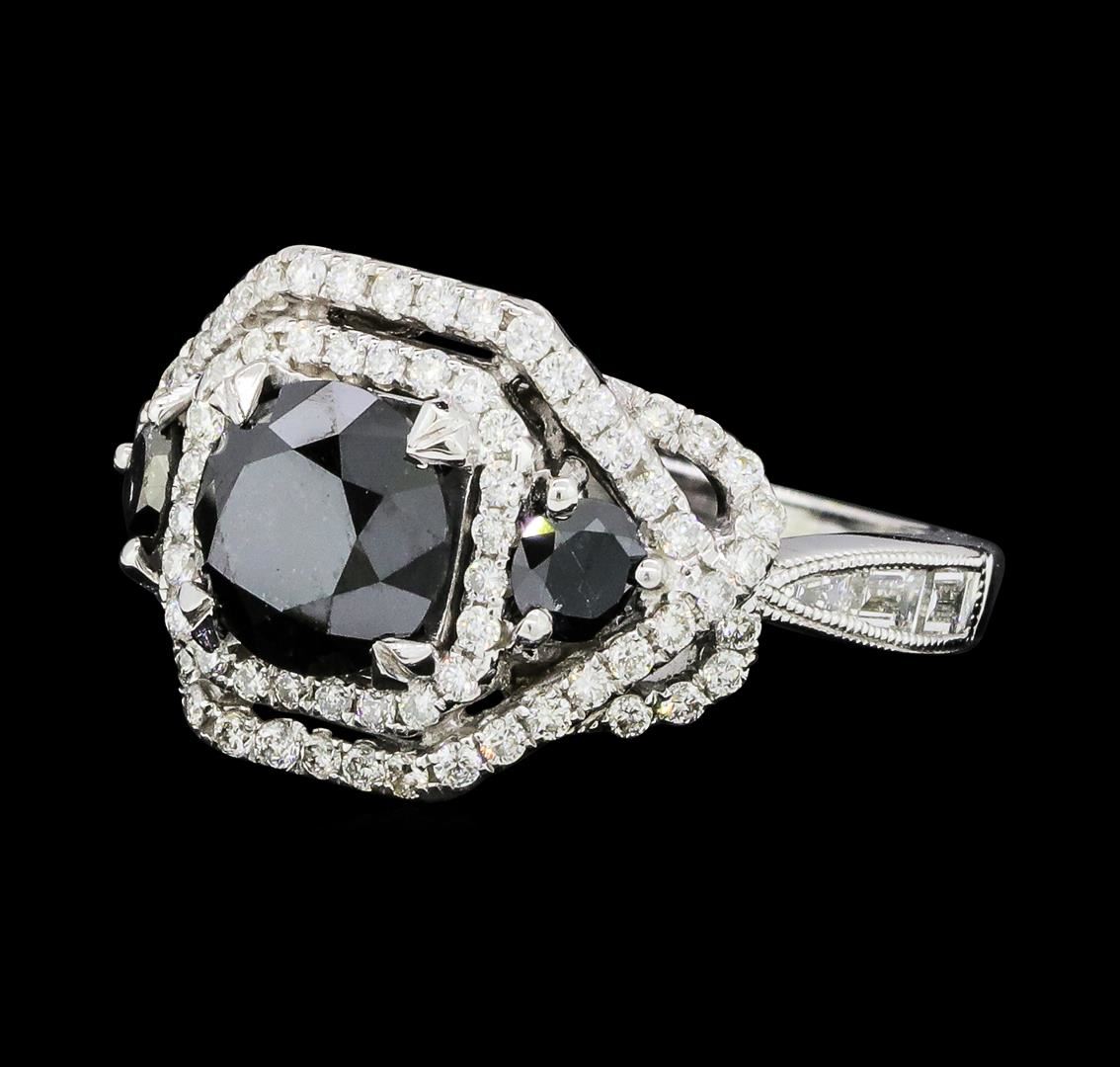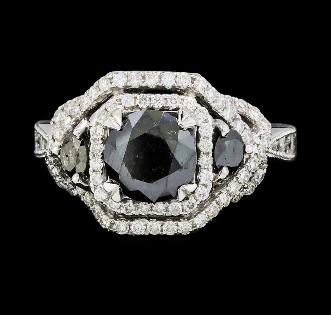 One electronically tested 18KT white gold lady's cast fashion ring with a cathedral cushion halo with a bright polish with milgrain detailing finish. The featured lady's ring has a shank measuring 1.68 millimeters wide. Identified with markings of '18K 750'. Condition is new, good workmanship. Containing: One prong set round brilliant cut diamond, measuring 7.15 - 7.13 x 4.85mm (depth est.) , 5.00.%. GTCF approximate weight of 1.60ct. The featured black diamond has faint red overtones. Colored gemstones are presumed to have been subjected to commonly used enhancement processes. Graded in the setting. Color Fancy Black Cut Good Two prong set round brilliant cut diamonds, measuring 3.60 - 3.50 x 2.20mm (depth est.) approximate total weight of 2 Stones = 0.34ct. Colored gemstones are presumed to have been subjected to commonly used enhancement processes. Graded in the setting. Color Fancy Black Cut Good Six channel set baguette cut diamonds, measuring from 2.50 x 1.30 x 1.11mm (depth est.) to 2.60 x 1.80 x 1.54mm (depth est.) approximate total weight of 6 Stones = 0.30ct. Graded in the setting. Color G - H Clarity VS-2 to SI-1 Cut Very Good Eighty-Two prong set round brilliant cut diamonds, measuring 1.20 - 1.10 x 0.71mm (depth est.) approximate total weight of 82 Stones = 0.47ct. Graded in the setting. Color H - I Clarity SI-1 to SI-2 Cut Good. Total Weight of Diamonds 2.71ct.. Total Weight of Ring 6.20gm GAS Appraised at $7500.00. GAS Appraised at $7,500.00.