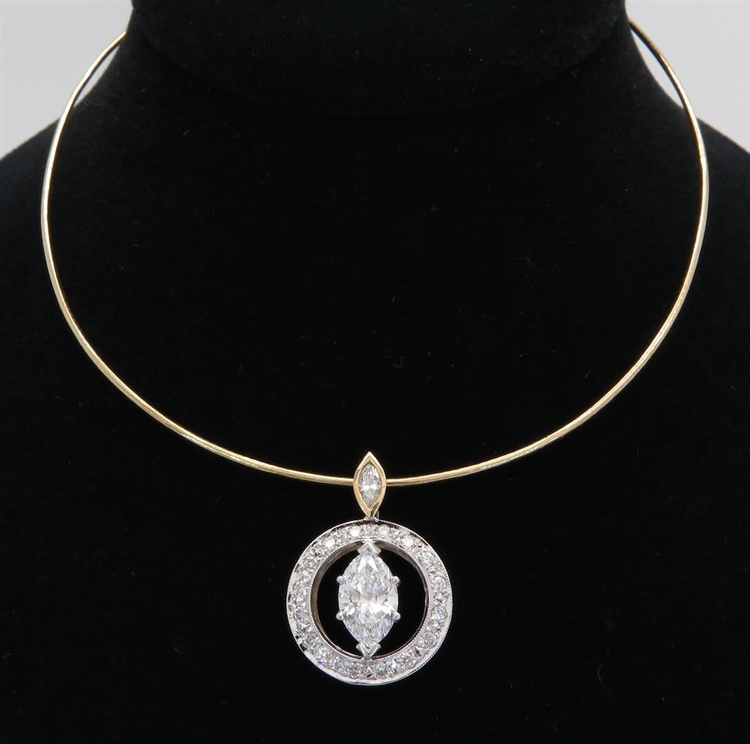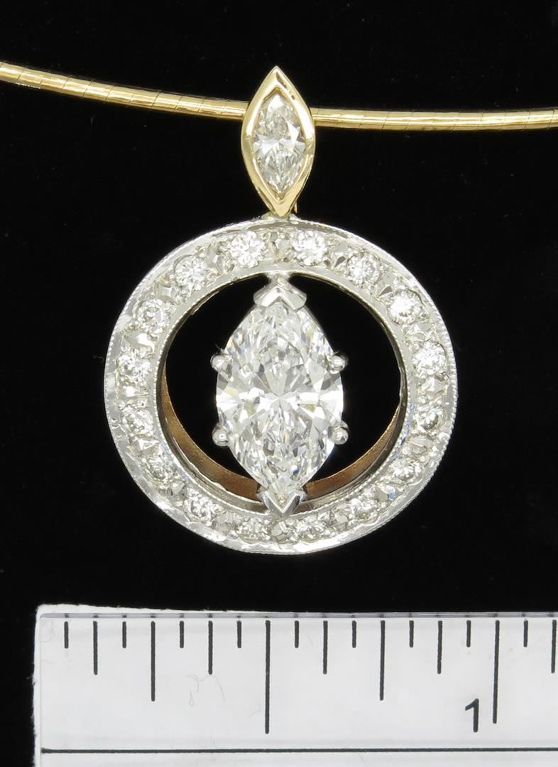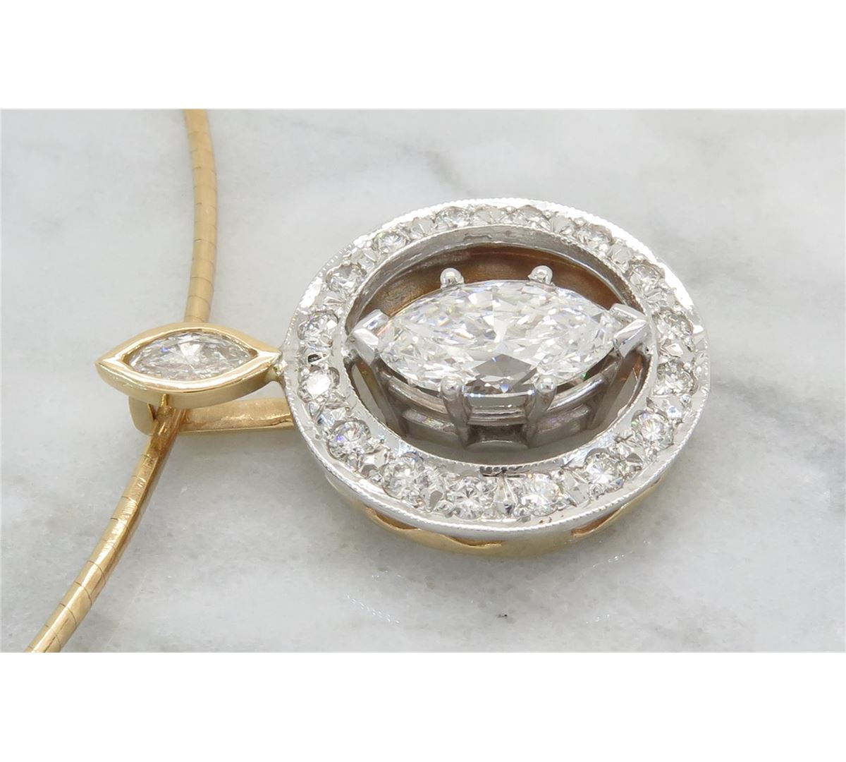 One tested 14K gold diamond pendant. Containing: One Marquise Cut Diamond. Approximate size: 2.01CT. Clarity: SI1, Color: F-G. 16 Round Brilliant Cut Diamonds, 1 Marquise Cut Diamond. Approximate total diamond weight: 2.71CTW. Diamonds are graded in the mounting, unless otherwise stated. Weight: 11.8 grams, Size of chain: 18".