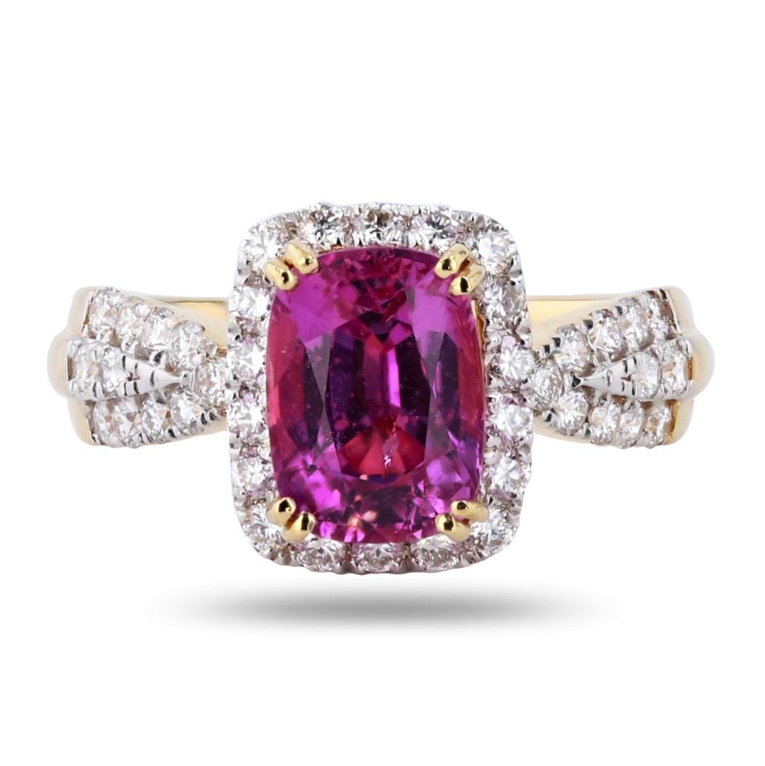 One 18k Yellow Gold Sapphire & Diamond Ring. Weighing 4.90 Grams. Containing: One Cushion Cut Natural Sapphire. GIA Report Number: 2215477578 Measurements: 8.91 x 6.54 x 4.98mm Weight: 2.71 carat Color: Purplish-Pink Transparency: Transparent Treatment: Heated Thirty Nine round brilliant-cut diamonds in pave set. Total Weight: 0.66 carats Average Color: G - H Average Clarity: SI1 to SI2 #LREF-6998