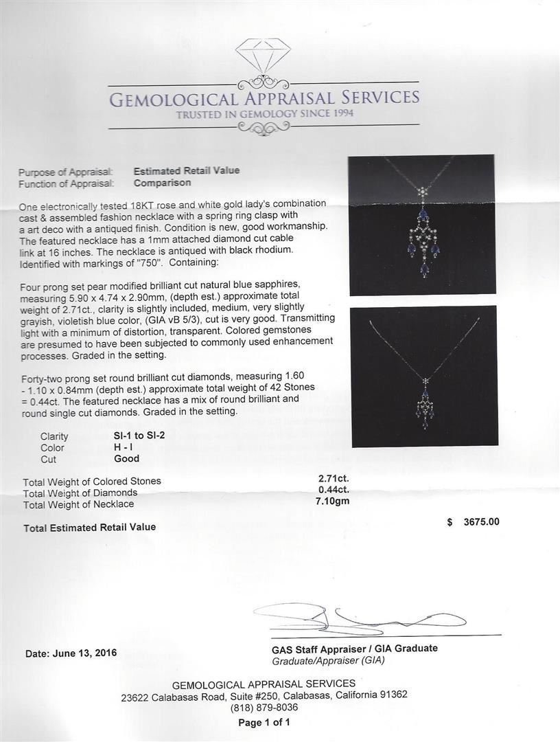 One electronically tested 18KT rose and white gold lady's combination cast & assembled fashion necklace with a spring ring clasp with a art deco with a antiqued finish. The featured necklace has a 1mm attached diamond cut cable link at 16 inches. The necklace is antiqued with black rhodium. Identified with markings of "750". Condition is new, good workmanship. Containing: Four prong set pear modified brilliant cut natural blue sapphires, measuring 5.90 x 4.74 x 2.90mm, (depth est.) approximate total weight of 2.71ct., clarity is slightly included, medium, very slightly grayish, violetish blue color, (GIA vB 5/3), cut is very good. Transmitting light with a minimum of distortion, transparent. Colored gemstones are presumed to have been subjected to commonly used enhancement processes. Graded in the setting. Forty-Two prong set round brilliant cut diamonds, measuring 1.60 - 1.10 x 0.84mm (depth est.) approximate total weight of 42 Stones = 0.44ct. The featured necklace has a mix of round brilliant and round single cut diamonds. Graded in the setting. Clarity: SI-1 to SI-2. Color: H - I. Cut Good. Total Weight of Colored Stones 2.71ct. Total Weight of Diamonds 0.44ct. Total Weight of Necklace 7.10gm. GAS Appraised at $3,675.00.