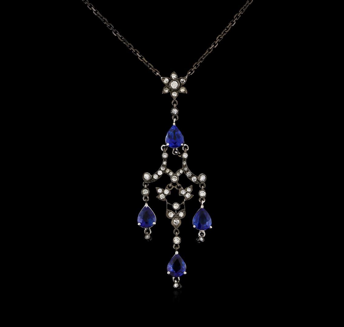 One electronically tested 18KT rose and white gold lady's combination cast & assembled fashion necklace with a spring ring clasp with a art deco with a antiqued finish. The featured necklace has a 1mm attached diamond cut cable link at 16 inches. The necklace is antiqued with black rhodium. Identified with markings of "750". Condition is new, good workmanship. Containing: Four prong set pear modified brilliant cut natural blue sapphires, measuring 5.90 x 4.74 x 2.90mm, (depth est.) approximate total weight of 2.71ct., clarity is slightly included, medium, very slightly grayish, violetish blue color, (GIA vB 5/3), cut is very good. Transmitting light with a minimum of distortion, transparent. Colored gemstones are presumed to have been subjected to commonly used enhancement processes. Graded in the setting. Forty-Two prong set round brilliant cut diamonds, measuring 1.60 - 1.10 x 0.84mm (depth est.) approximate total weight of 42 Stones = 0.44ct. The featured necklace has a mix of round brilliant and round single cut diamonds. Graded in the setting. Clarity: SI-1 to SI-2. Color: H - I. Cut Good. Total Weight of Colored Stones 2.71ct. Total Weight of Diamonds 0.44ct. Total Weight of Necklace 7.10gm. GAS Appraised at $3,675.00.