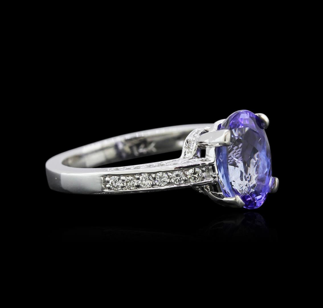 One electronically tested 14KT white gold ladies cast tanzanite and diamond ring with a bright polish finish. The featured tanzanite is supported by a diamond under gallery and diamond set shoulders, completed by a two and one-half millimeter wide band. Identified with markings of "14K". Condition is new, good workmanship. Containing: One prong set oval mixed cut natural tanzanite approximate weight of 2.71ct., clarity is eye clean, type I, medium dark, very slightly grayish, bluish violet color, (GIA bV 6/3), cut is good. Transmitting light with no distortion, transparent. Graded in the setting. Tanzanite is a very rare gemstone that is only found in the country of Tanzania. Originally discovered in 1967. Tiffany & Company, named the stone Tanzanite. It is found in the Usumburu Mountains that border the Umba Valley of northern Tanzania. Tanzanite occurs in gray, brown, violet, blue, reddish-purple, & green. The gem is interesting because of its exceptional pleochroism. Rotated in different directions a tanzanite will exhibit multiple changes of color. Tanzanite has a low tolerance to ultrasonic cleaning, and should not be cleaned using this method. Ninety-Two prong set round brilliant cut diamonds approximate total weight of 92 Stones = 0.50ct. Graded in the setting. Clarity SI-1 to SI-2 Color H - J. Total Weight of Colored Stones 2.71ct. Total Weight of Diamonds 0.50ct. Total Weight of Ring 4.59 grams. AIG Appraised at $8,420.00.