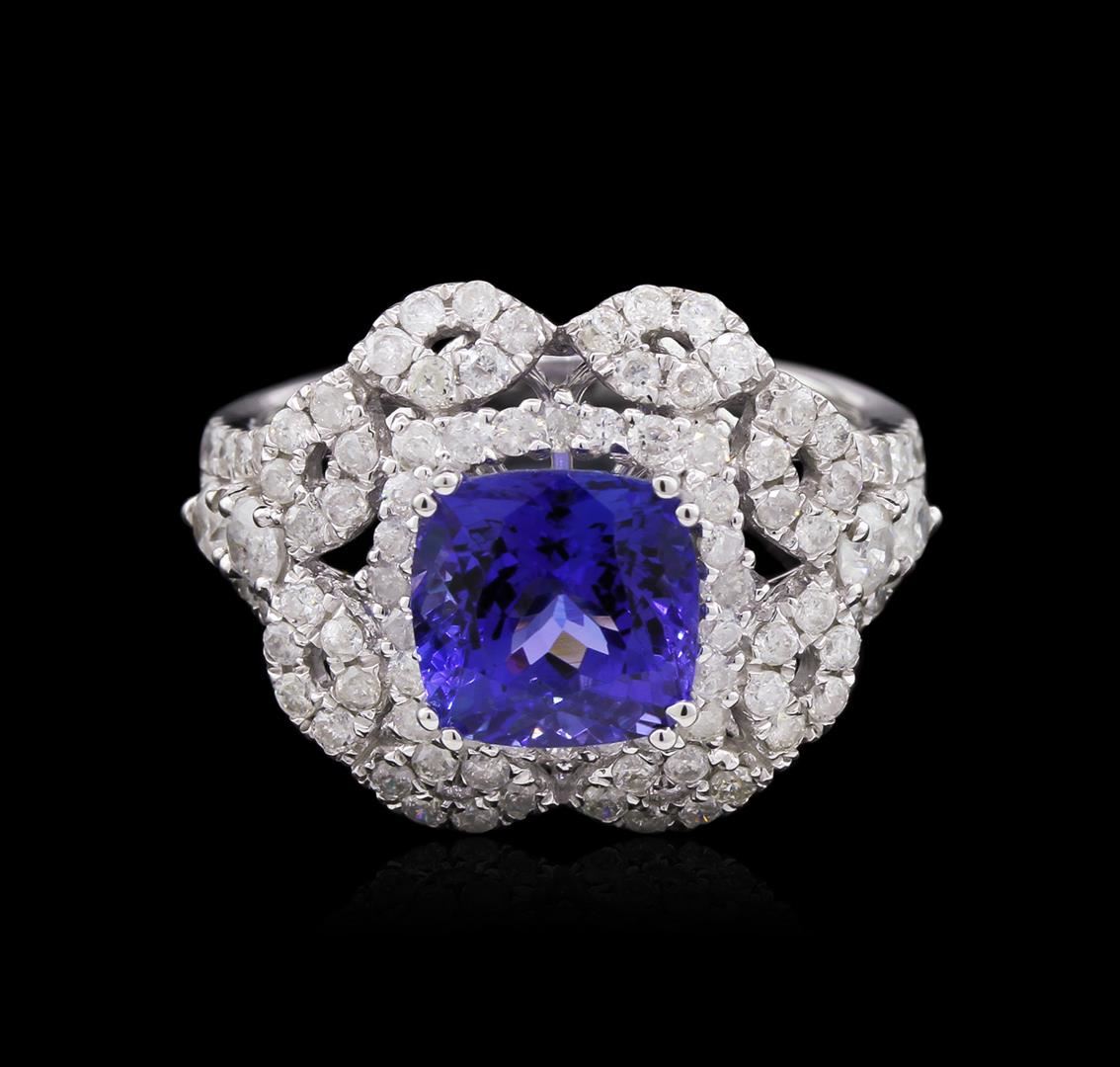 One electronically tested 14KT white gold ladies cast tanzanite and diamond ring with a bright polish finish. The featured tanzanite is set within a stylized diamond set floral bezel supported by diamond set split shoulders, completed by a one and one-half millimeter wide band. Trademark is Orianne. Identified with markings of "14K". Condition is new, good workmanship. Containing: One prong set square cushion mixed cut natural tanzanite approximate weight of 2.71ct., clarity is eye clean, type I, dark, moderately strong, bluish violet color, (GIA bV 7/4), cut is good. Transmitting light with no distortion, transparent. Graded in the setting. Tanzanite is a very rare gemstone that is only found in the country of Tanzania. Originally discovered in 1967. Tiffany & Company, named the stone Tanzanite. It is found in the Usumburu Mountains that border the Umba Valley of northern Tanzania. Tanzanite occurs in gray, brown, violet, blue, reddish-purple, & green. The gem is interesting because of its exceptional pleochroism. Rotated in different directions a tanzanite will exhibit multiple changes of color. Tanzanite has a low tolerance to ultrasonic cleaning, and should not be cleaned using this method. Ninety-Six prong set round brilliant cut diamonds approximate total weight of 96 Stones = 1.25ct. Graded in the setting. Clarity: SI-2 to I-2. Color: G - I. Total Weight of Colored Stones 2.71ct. Total Weight of Diamonds 1.25ct. Total Weight of Ring 4.67gm. AIG Appraised at $9,625.00.