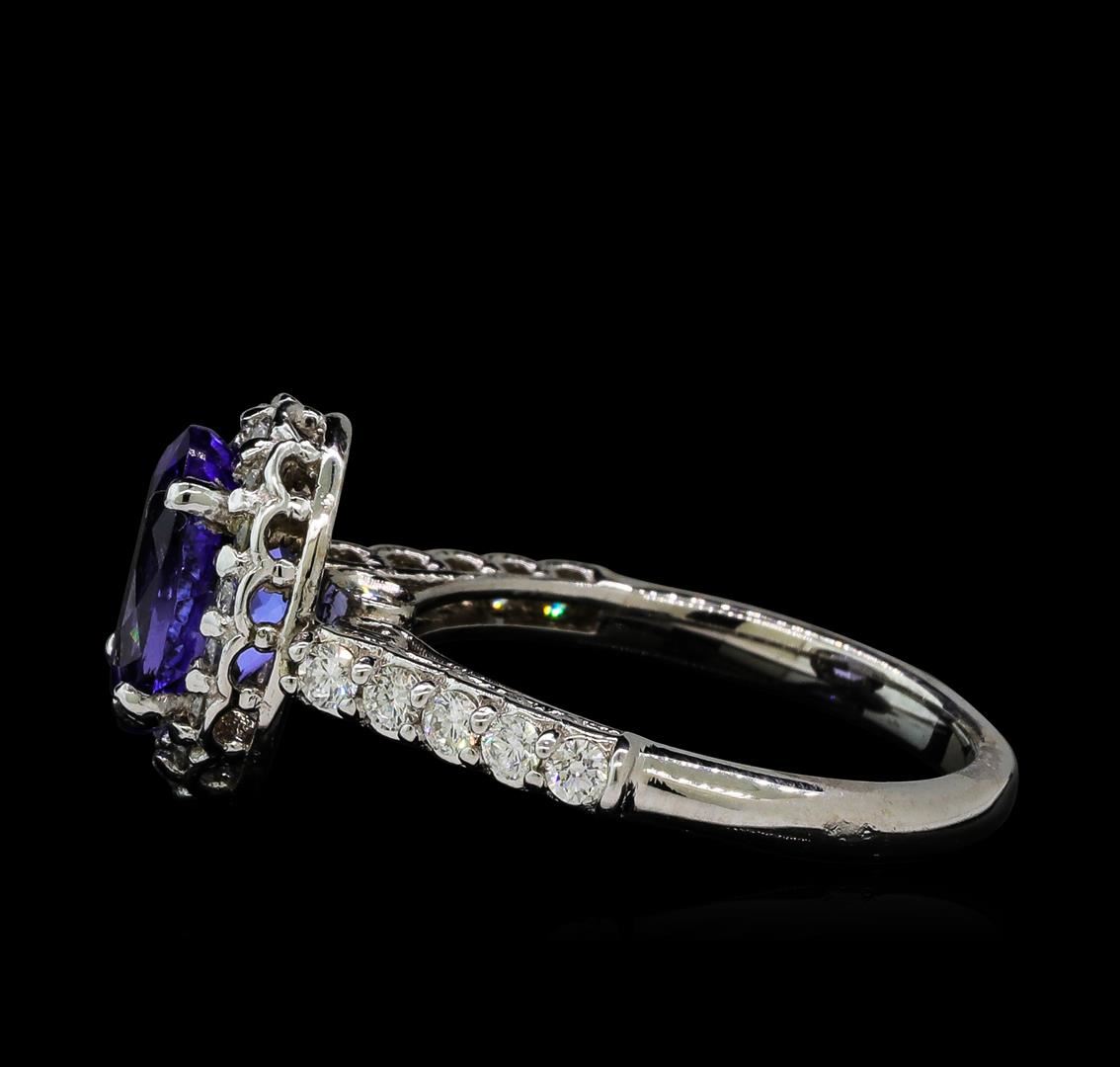 One electronically tested 14KT white gold ladies cast & assembled tanzanite and diamond ring with a bright polish finish. The featured tanzanite is set within a diamond bezel supported by a diamond accented under gallery and diamond set shoulders, completed by a two millimeter wide band. Identified with markings of '14K'. Condition is new, good workmanship. Containing: One prong set oval mixed cut natural tanzanite, measuring 9.40 x 7.50 x 5.30mm, 3%. bulge factor, approximate weight of 2.71ct., clarity is eye clean, type I, medium, very slightly grayish, bluish violet color, (GIA bV 5/3), cut is good. Transmitting light with no distortion, transparent. Graded in the setting. Tanzanite is a very rare gemstone that is only found in the country of Tanzania. Originally discovered in 1967. Tiffany & Company, named the stone Tanzanite. It is found in the Usumburu Mountains that border the Umba Valley of northern Tanzania. Tanzanite occurs in gray, brown, violet, blue, reddish-purple, & green. The gem is interesting because of its exceptional pleochroism. Rotated in different directions a tanzanite will exhibit multiple changes of color. Tanzanite has a low tolerance to ultrasonic cleaning, and should not be cleaned using this method. Twelve prong & bezel set round brilliant cut diamonds, measuring 2.00 - 2.00 x 1.20mm (depth est.) approximate total weight of 12 Stones = 0.40ct. Graded in the setting. Clarity SI-2 to I-2. Color: F - H Sixteen prong set round brilliant cut diamonds, measuring 1.50 - 1.50 x 0.90mm (depth est.) approximate total weight of 16 Stones = 0.24ct. Graded in the setting. Clarity SI-2 to I-2. Color: G - I. Total Weight of Colored Stones 2.71ct.. Total Weight of Diamonds 0.64ct.. Total Weight of Ring 4.89gm. AIG Appraised at $7,305.00.