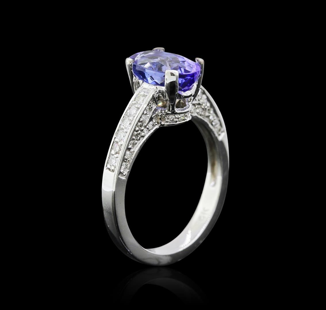 One electronically tested 14KT white gold ladies cast tanzanite and diamond ring with a bright polish finish. The featured tanzanite is supported by a diamond under gallery and diamond set shoulders, completed by a two and one-half millimeter wide band. Identified with markings of "14K". Condition is new, good workmanship. Containing: One prong set oval mixed cut natural tanzanite approximate weight of 2.71ct., clarity is eye clean, type I, medium dark, very slightly grayish, bluish violet color, (GIA bV 6/3), cut is good. Transmitting light with no distortion, transparent. Graded in the setting. Tanzanite is a very rare gemstone that is only found in the country of Tanzania. Originally discovered in 1967. Tiffany & Company, named the stone Tanzanite. It is found in the Usumburu Mountains that border the Umba Valley of northern Tanzania. Tanzanite occurs in gray, brown, violet, blue, reddish-purple, & green. The gem is interesting because of its exceptional pleochroism. Rotated in different directions a tanzanite will exhibit multiple changes of color. Tanzanite has a low tolerance to ultrasonic cleaning, and should not be cleaned using this method. Ninety-Two prong set round brilliant cut diamonds approximate total weight of 92 Stones = 0.50ct. Graded in the setting. Clarity SI-1 to SI-2 Color H - J. Total Weight of Colored Stones 2.71ct. Total Weight of Diamonds 0.50ct. Total Weight of Ring 4.59 grams. AIG Appraised at $8,420.00.