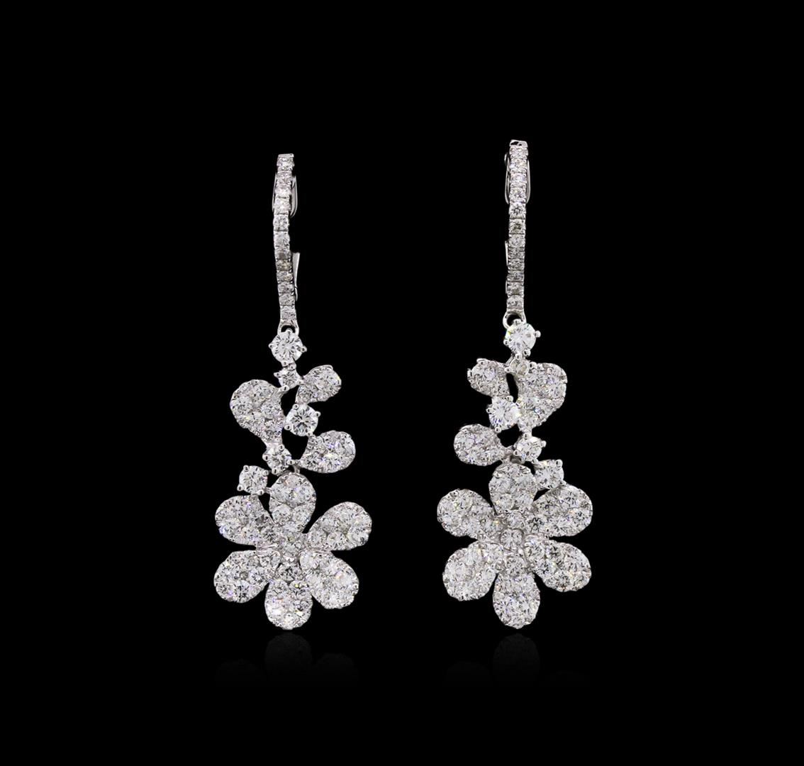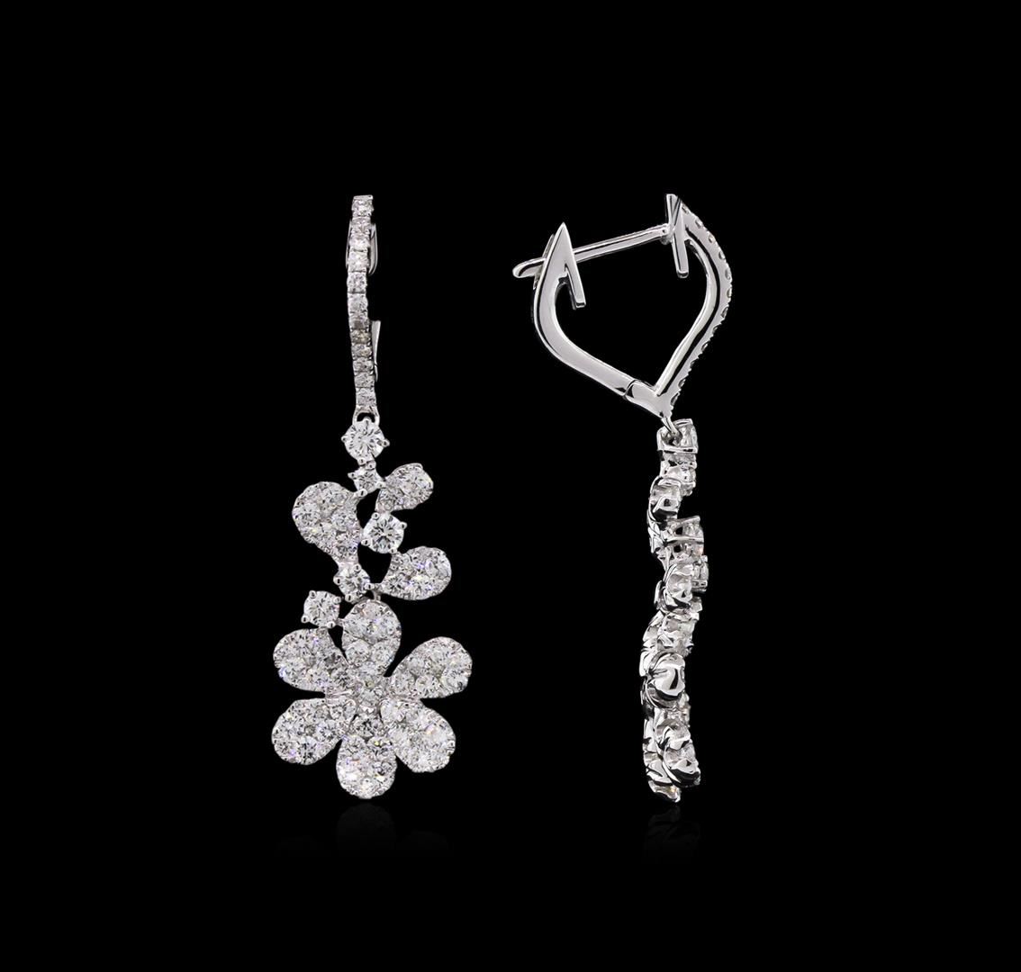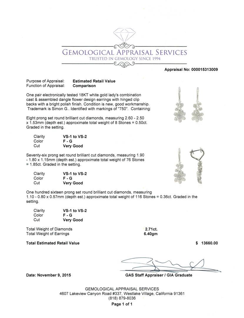 One pair electronically tested 18KT white gold lady's combination cast & assembled dangle flower design earrings with hinged clip backs with a bright polish finish. Trademark is Simon G. Identified with markings of "750". Condition is new, good workmanship. Containing: Eight prong set round brilliant cut diamonds, measuring 2.60 - 2.50 x 1.53mm (depth est.) approximate total weight of 8 Stones = 0.50ct. Diamond is chipped. Clarity: VS-1 to VS-2. Color: F - Very Good Seventy-Six prong set round brilliant cut diamonds, measuring 1.90 - 1.80 x 1.15mm (depth est.) approximate total weight of 76 Stones = 1.85ct. Graded in the setting. Clarity: VS-1 to VS-2. Color: F - Very Good One Hundred Sixteen prong set round brilliant cut diamonds, measuring 1.10 - 0.80 x 0.57mm (depth est.) approximate total weight of 116 Stones = 0.36ct. Graded in the setting. Clarity: VS-1 to VS-2. Color: F - Very Good. Total Weight of Diamonds 2.71ct. Total Weight of Earrings 6.40gm. GAS Appraised at $13,660.00.