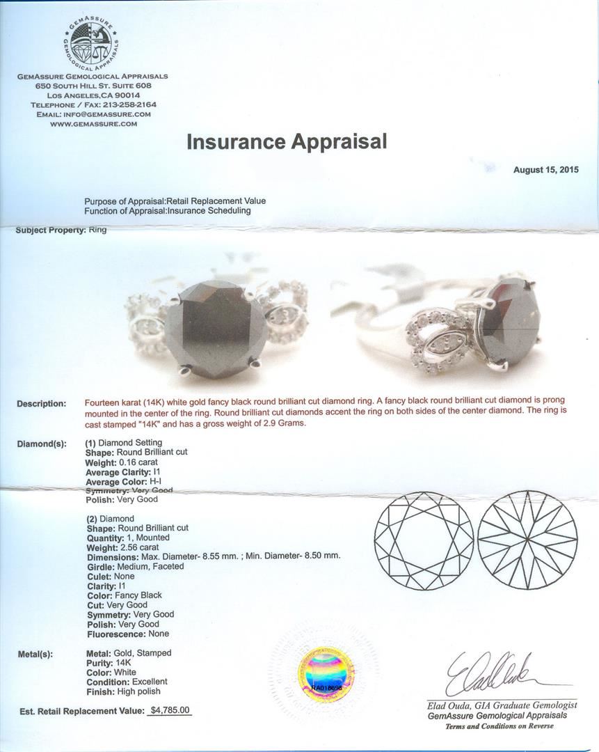 Fourteen karat (14K) white gold fancy black round brilliant cut diamond ring. A Fancy black round brilliant cut diamond is prong mounted in the center of the ring. Round brilliant cut diamonds accent the ring on both sides of the center diamond. The ring is cast stamped "14K" and has a gross weight of 2.9 grams. Diamond(s): (1) Diamond setting. Shape: Round brilliant cut. Weight: 0.16 carat. Average clarity: I1. Average color: H-I. Symmetry: Very good. Polish: Very good. (2) Diamond- Shape: Round brilliant cut. Quantity: 1, mounted. Weight: 2.56 carat. Dimensions: Max. Diameter-8.55 mm. ; Min Diameter-8.50mm. Girdle: Medium, faceted. Cutlet: None. Clarity: I1. Color: Fancy black. Cut: Very good. Symmetry Very good. Polish: Very good. Fluorescence: None. Metal(s): Metal: Gold, stamped. Purity: 14K. Color: White. Condition: Excellent. Finish: High polish. GGA Appraised at $4,785.00.