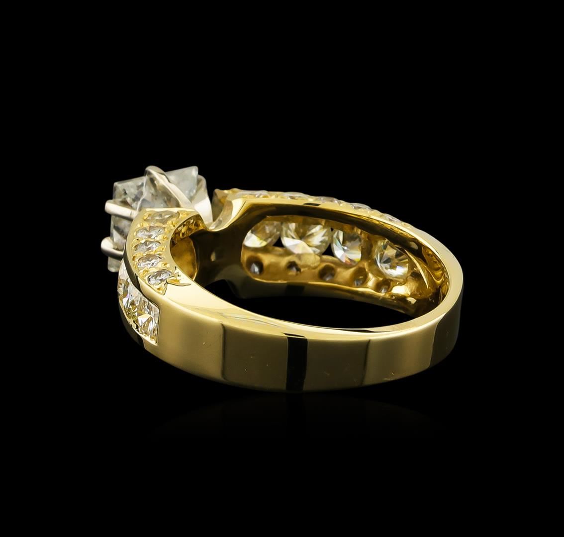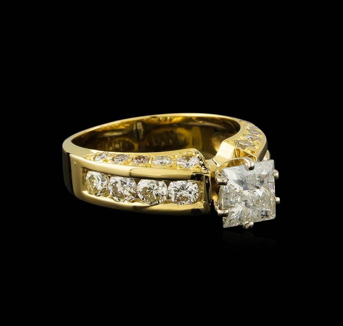 One electronically tested 14KT yellow gold lady's cast wedding ring with a bright polish finish. The featured lady's ring has a shank measuring 3.53 millimeters wide. Identified with markings of "14K". Condition is new, good workmanship. Containing: One prong set princess cut diamond, measuring 5.97 x 5.92 x 4.20mm (depth est.) approximate weight of 1.22ct. Graded in the setting. Clarity: I-1. Color: Good Eight channel set round brilliant cut diamonds, measuring 3.30 - 3.20 x 1.95mm (depth est.) approximate total weight of 8 Stones = 1.00ct. Graded in the setting. Clarity: SI-1 to I-1. Color: G - Good Twenty prong set round brilliant cut diamonds, measuring 2.40 - 1.60 x 1.24mm (depth est.) approximate total weight of 20 Stones = 0.50ct. Graded in the setting. Clarity: SI-2 to I-1. Color: G - I. Cut Good. Total Weight of Diamonds 2.72ct. Total Weight of Ring 5.30gm GAS Appraised at $12,425.00.