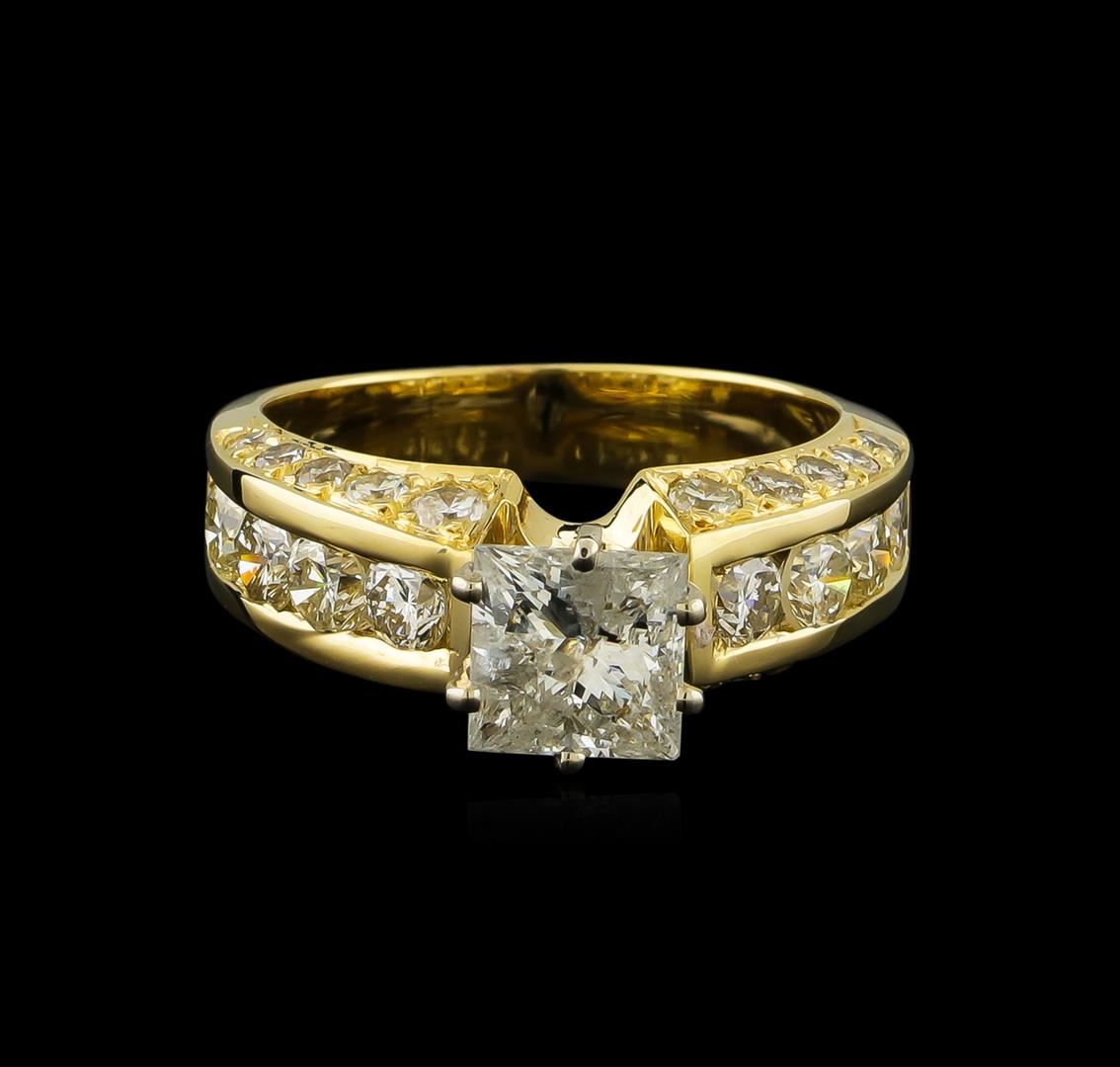 One electronically tested 14KT yellow gold lady's cast wedding ring with a bright polish finish. The featured lady's ring has a shank measuring 3.53 millimeters wide. Identified with markings of "14K". Condition is new, good workmanship. Containing: One prong set princess cut diamond, measuring 5.97 x 5.92 x 4.20mm (depth est.) approximate weight of 1.22ct. Graded in the setting. Clarity: I-1. Color: Good Eight channel set round brilliant cut diamonds, measuring 3.30 - 3.20 x 1.95mm (depth est.) approximate total weight of 8 Stones = 1.00ct. Graded in the setting. Clarity: SI-1 to I-1. Color: G - Good Twenty prong set round brilliant cut diamonds, measuring 2.40 - 1.60 x 1.24mm (depth est.) approximate total weight of 20 Stones = 0.50ct. Graded in the setting. Clarity: SI-2 to I-1. Color: G - I. Cut Good. Total Weight of Diamonds 2.72ct. Total Weight of Ring 5.30gm GAS Appraised at $12,425.00.
