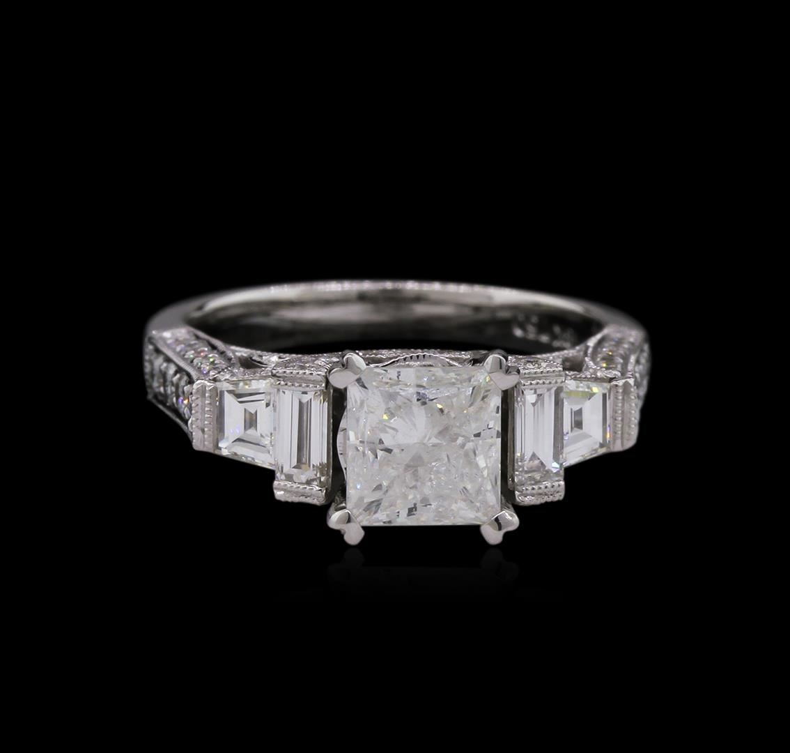One electronically tested 18KT white gold ladies cast diamond unity ring. The featured diamond is set within a diamond accented basket supported by an elaborate diamond set under gallery and diamond set shoulders, completed by a two and one-half millimeter wide band. Bright polish finish with milgrain detailing. Identified with markings of "18K 750". Condition is new, good workmanship. Containing: One prong set princess cut diamond, measuring 6.14 x 5.95 x 4.50mm (depth est.), 6.00.%. GTCF approximate weight of 1.52ct. Graded in the setting. Clarity: I-1. Color: 75.6%. Table 63.9%. Two channel set baguette cut (tapered) diamonds, measuring 3.00 x 3.20 x 2.24mm (depth est.) approximate total weight of 2 Stones = 0.38ct. Graded in the setting. Clarity: VS-1. Color: G Two channel set baguette cut diamonds, measuring 4.20 x 2.15 x 1.51mm (depth est.) approximate total weight of 2 Stones = 0.24ct. Graded in the setting. Clarity: VS-1 to VS-2. Color: G Eight bead set round brilliant cut diamonds, measuring 1.90 - 1.80 x 1.11mm (depth est.) approximate total weight of 8 Stones = 0.20ct. Graded in the setting. Clarity: VS-2 to SI-1. Color: G - I Fifty bead set round brilliant cut diamonds, measuring 1.40 - 1.10 x 0.75mm (depth est.) approximate total weight of 50 Stones = 0.38ct. Graded in the setting. Clarity: SI-1 to I-1. Color: G - I. Total Weight of Diamonds 2.72ct. Total Weight of Ring 6.41gm. AIG Appraised at $17,770.00.