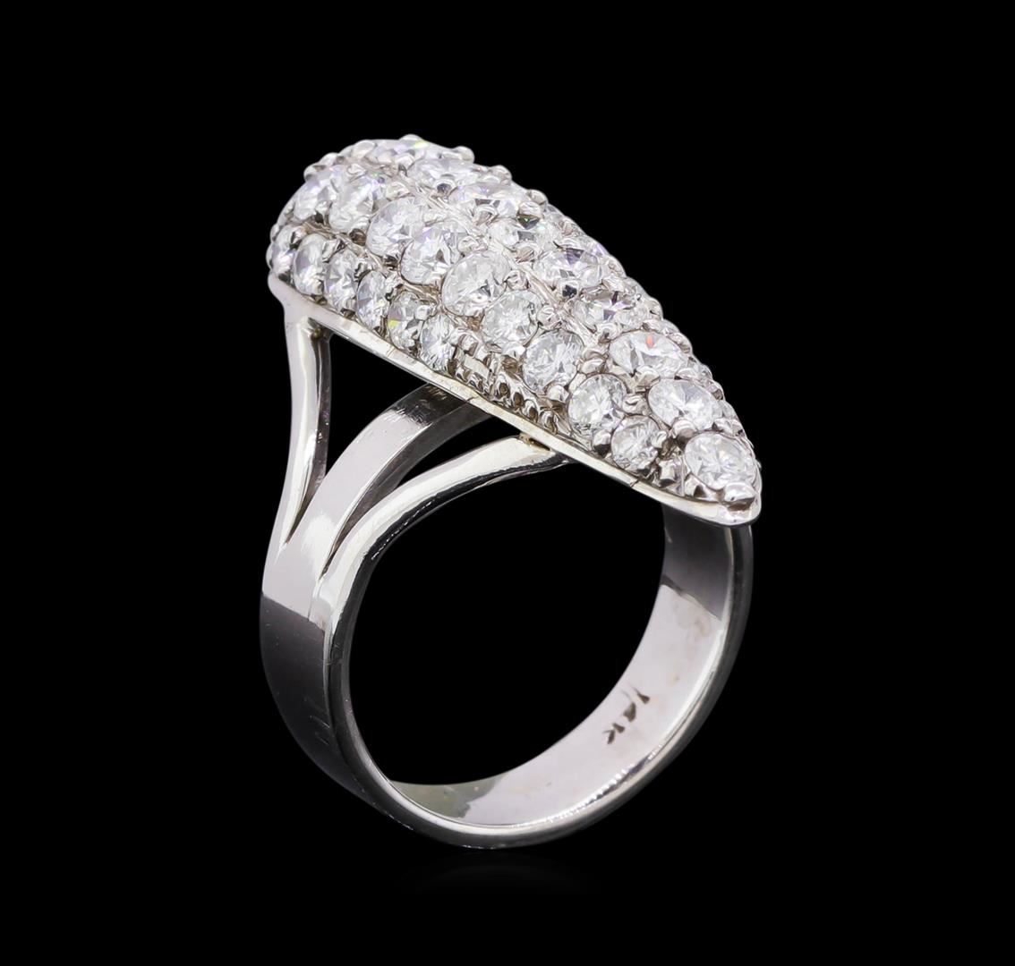 One electronically tested 14KT white gold ladies cast diamond ring. The ring features an elongated diamond set curvature supported by three-way split shoulders, completed by a five millimeter wide band. Bright and patterned finish. Identified with markings of "14K". Condition is new, good workmanship. Containing: Twenty-One prong set round brilliant cut diamonds, measuring 3.10 - 2.70 x 1.74mm (depth est.) approximate total weight of 21 Stones = 1.80ct. Color & clarity grade are an average for the group. Graded in the setting. Clarity: SI-2 to I-2. Color: G - I Eight prong set round brilliant cut diamonds, measuring 2.50 - 2.50 x 1.50mm (depth est.) approximate total weight of 8 Stones = 0.46ct. Color & clarity grade are an average for the group. Graded in the setting. Clarity: SI-2 to I-1. Color: G - I Thirteen prong set round brilliant cut diamonds, measuring 2.30 - 2.00 x 1.29mm (depth est.) approximate total weight of 13 Stones = 0.47ct. Color & clarity grade are an average for the group. Graded in the setting. Clarity: SI-2 to I-1. Color: G - I. Total Weight of Diamonds 2.73ct. Total Weight of Ring 7.94gm. AIG Appraised at $7,910.00.