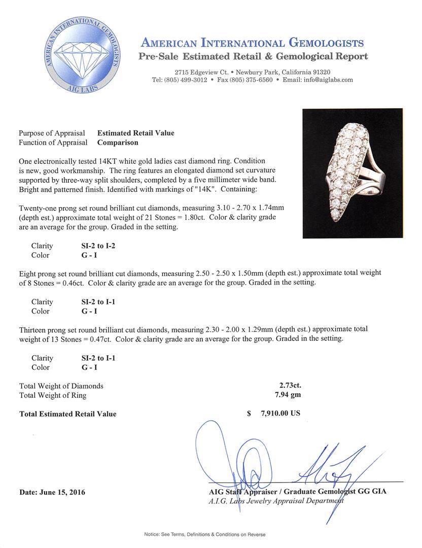 One electronically tested 14KT white gold ladies cast diamond ring. The ring features an elongated diamond set curvature supported by three-way split shoulders, completed by a five millimeter wide band. Bright and patterned finish. Identified with markings of "14K". Condition is new, good workmanship. Containing: Twenty-One prong set round brilliant cut diamonds, measuring 3.10 - 2.70 x 1.74mm (depth est.) approximate total weight of 21 Stones = 1.80ct. Color & clarity grade are an average for the group. Graded in the setting. Clarity: SI-2 to I-2. Color: G - I Eight prong set round brilliant cut diamonds, measuring 2.50 - 2.50 x 1.50mm (depth est.) approximate total weight of 8 Stones = 0.46ct. Color & clarity grade are an average for the group. Graded in the setting. Clarity: SI-2 to I-1. Color: G - I Thirteen prong set round brilliant cut diamonds, measuring 2.30 - 2.00 x 1.29mm (depth est.) approximate total weight of 13 Stones = 0.47ct. Color & clarity grade are an average for the group. Graded in the setting. Clarity: SI-2 to I-1. Color: G - I. Total Weight of Diamonds 2.73ct. Total Weight of Ring 7.94gm. AIG Appraised at $7,910.00.
