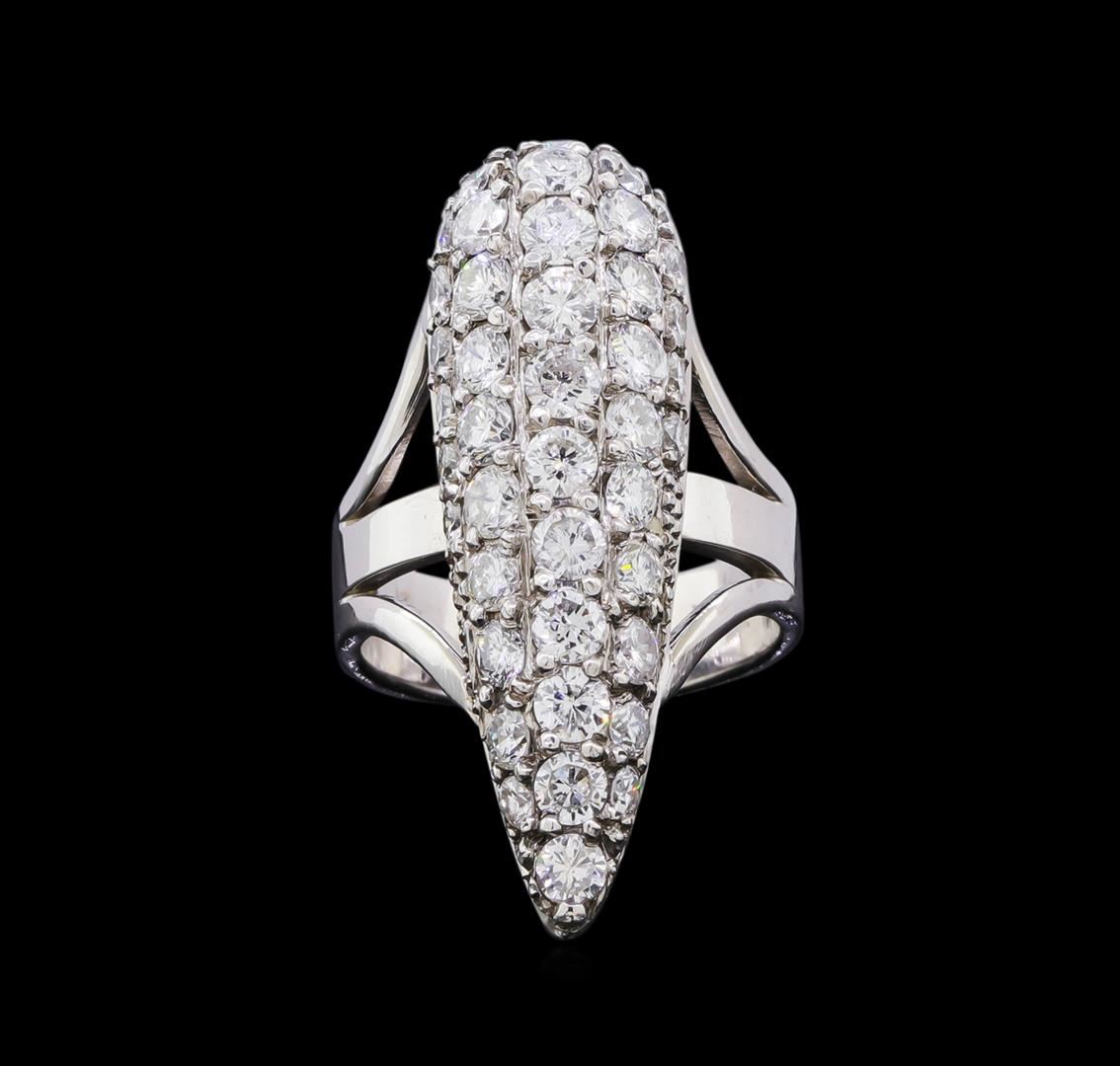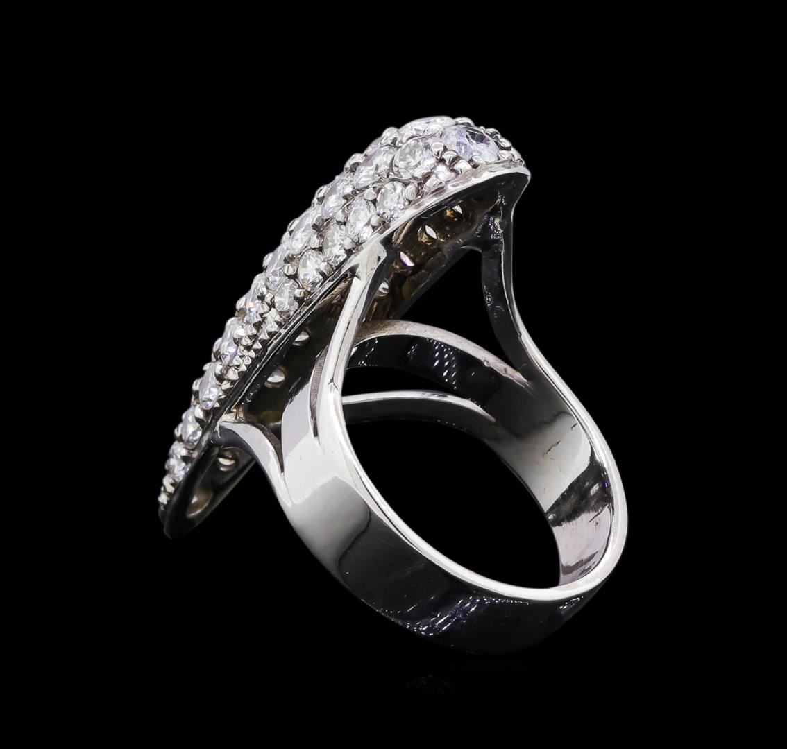 One electronically tested 14KT white gold ladies cast diamond ring. The ring features an elongated diamond set curvature supported by three-way split shoulders, completed by a five millimeter wide band. Bright and patterned finish. Identified with markings of "14K". Condition is new, good workmanship. Containing: Twenty-One prong set round brilliant cut diamonds, measuring 3.10 - 2.70 x 1.74mm (depth est.) approximate total weight of 21 Stones = 1.80ct. Color & clarity grade are an average for the group. Graded in the setting. Clarity: SI-2 to I-2. Color: G - I Eight prong set round brilliant cut diamonds, measuring 2.50 - 2.50 x 1.50mm (depth est.) approximate total weight of 8 Stones = 0.46ct. Color & clarity grade are an average for the group. Graded in the setting. Clarity: SI-2 to I-1. Color: G - I Thirteen prong set round brilliant cut diamonds, measuring 2.30 - 2.00 x 1.29mm (depth est.) approximate total weight of 13 Stones = 0.47ct. Color & clarity grade are an average for the group. Graded in the setting. Clarity: SI-2 to I-1. Color: G - I. Total Weight of Diamonds 2.73ct. Total Weight of Ring 7.94gm. AIG Appraised at $7,910.00.